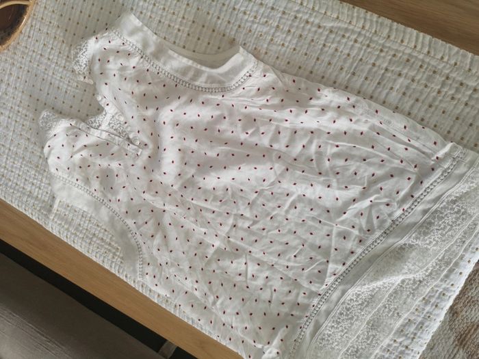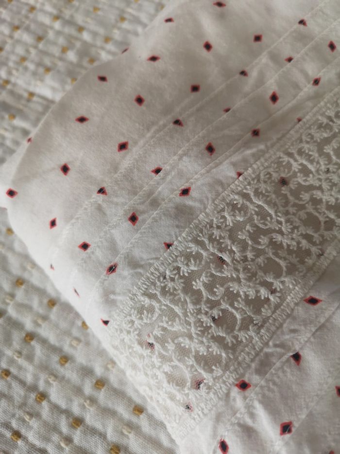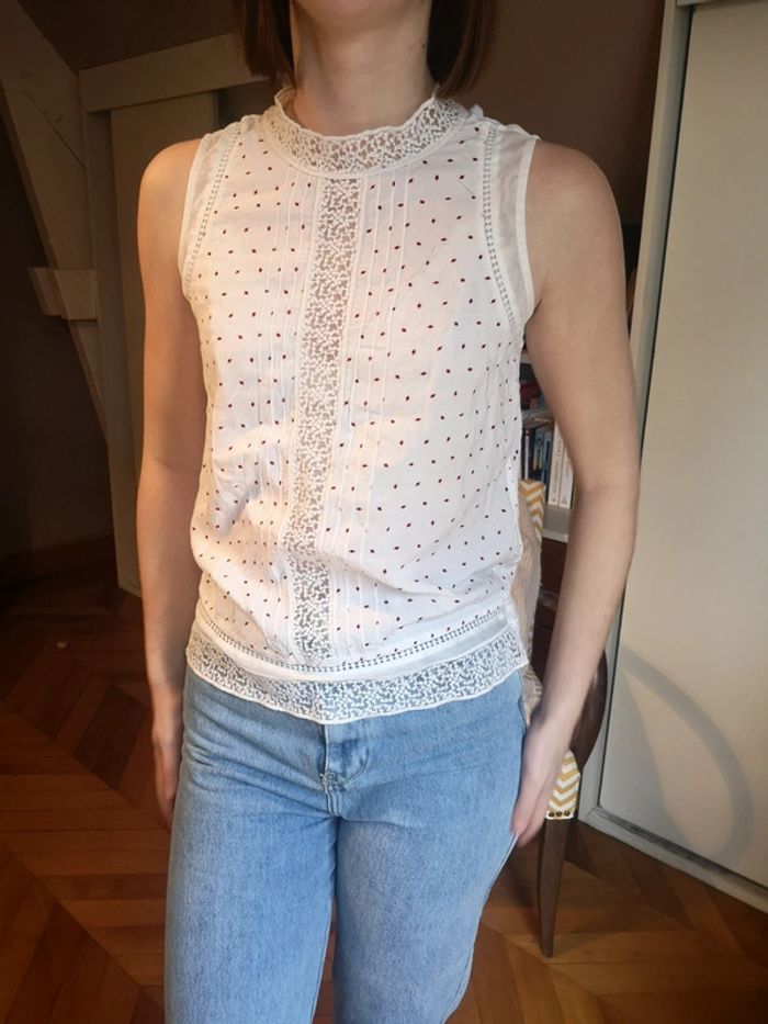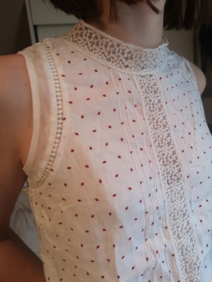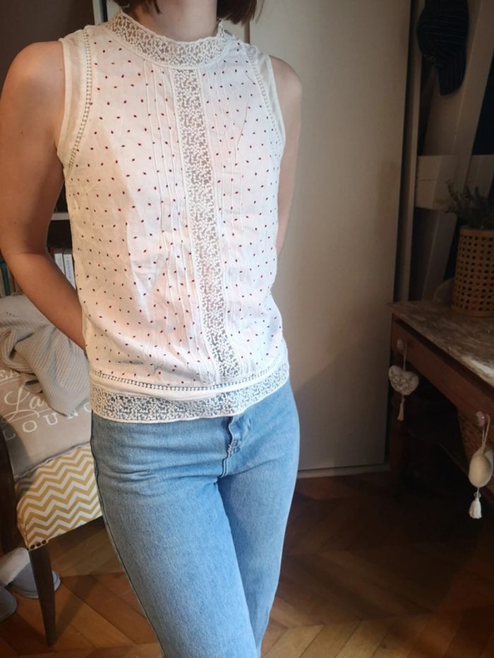 Blouse sans manches bohème Blanche Avec détails de dentelle et imprimé rouge Superbe Taille XS très bon état