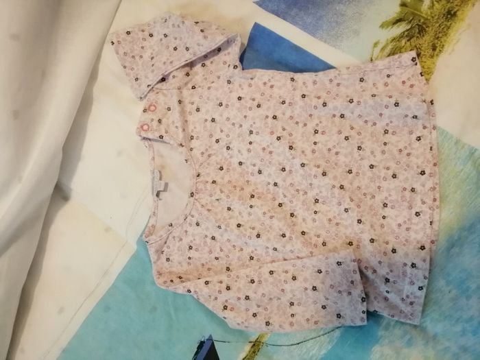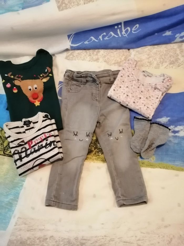 Lot comprenant 1 pull en 12mois 2 Tee-shirt manches longues. 1 terre et mer en 12mois 1 a fleurs en 18mois ( taille petit) 1 paire de chaussettes en 17/18 1 jeans orchestra. Un peu usés mais peu être porté.