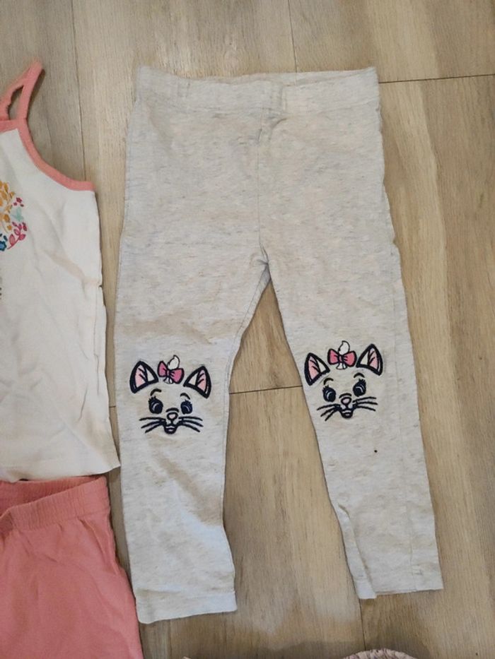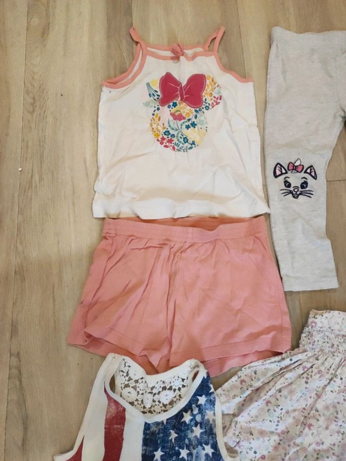 Le lot se compose d'un leggins Disney taché aux fesses voir photos un ensemble short débardeur minnie bon état général une jupe à fleurs en toile et un débardeur n'hésitez pas à regarder mon dressing j'ai d'autres articles et réduction sont activés😉