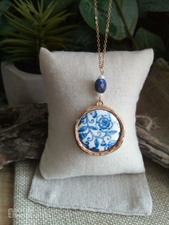 Collier lapis lazuli et médaillon faïence Vintage - photo numéro 1