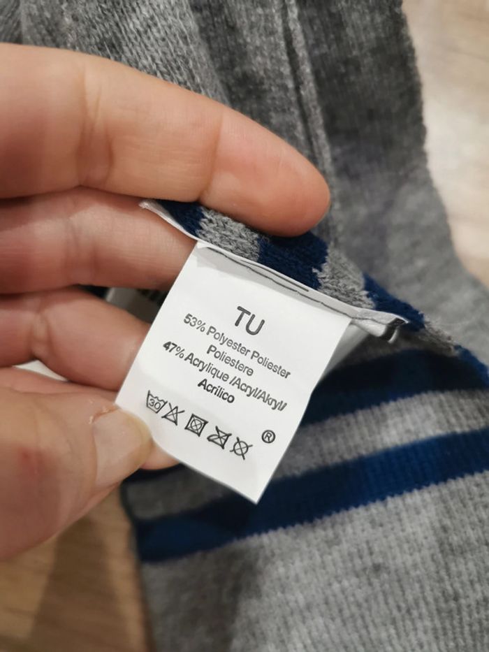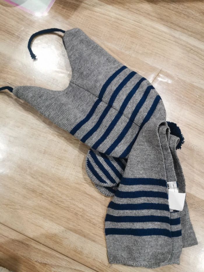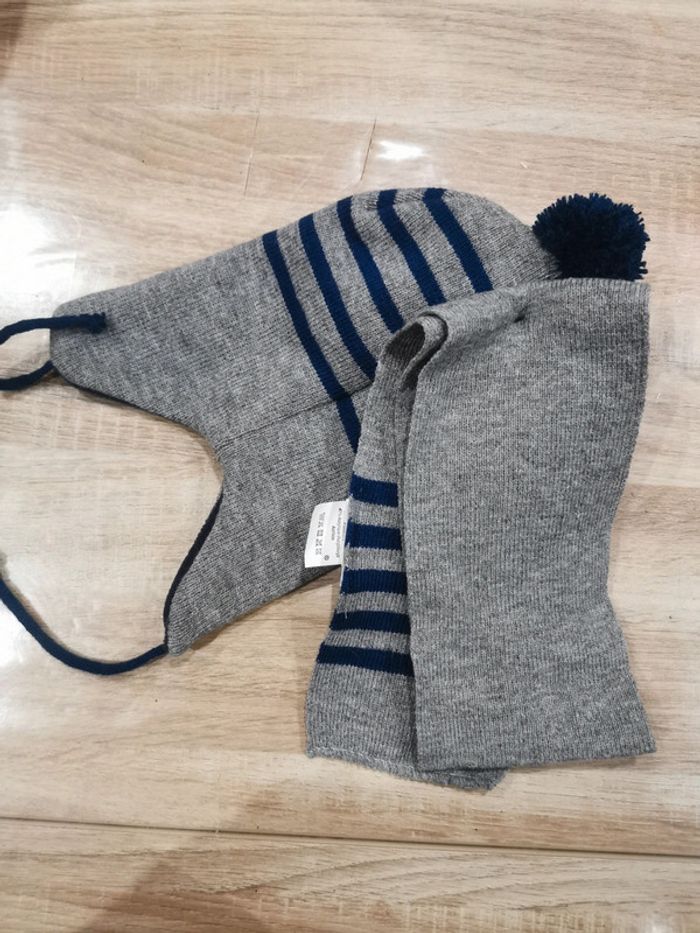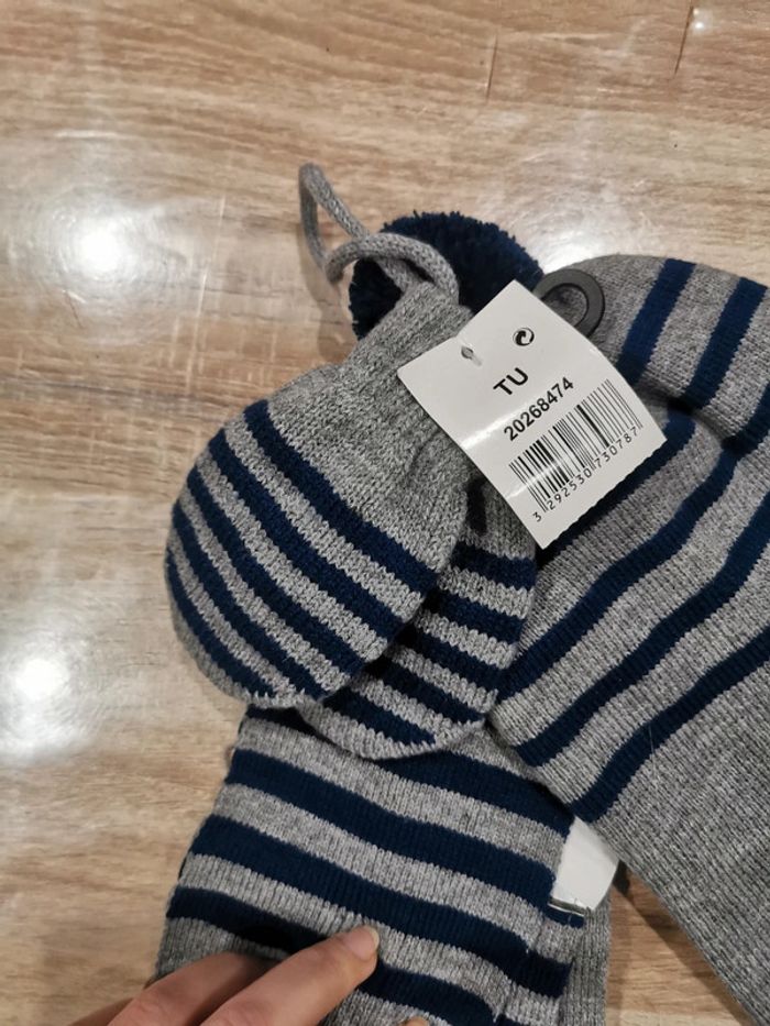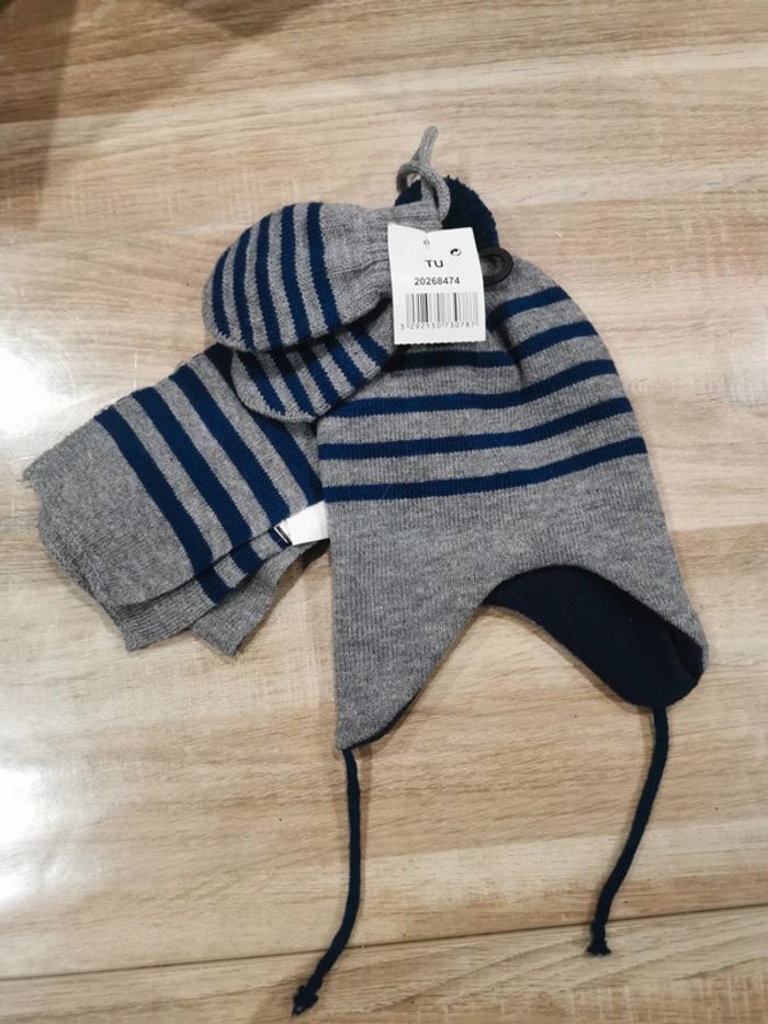 Ensemble composé d'un bonnet avec pompom Une echarpe Et une paire de mouffles avec cordon pour les passer dans les manches du manteau Neuf avec étiquette Taille unique mais je dirais que ça va a un 6-12 mois Gris et bleu marine #manteaupopo