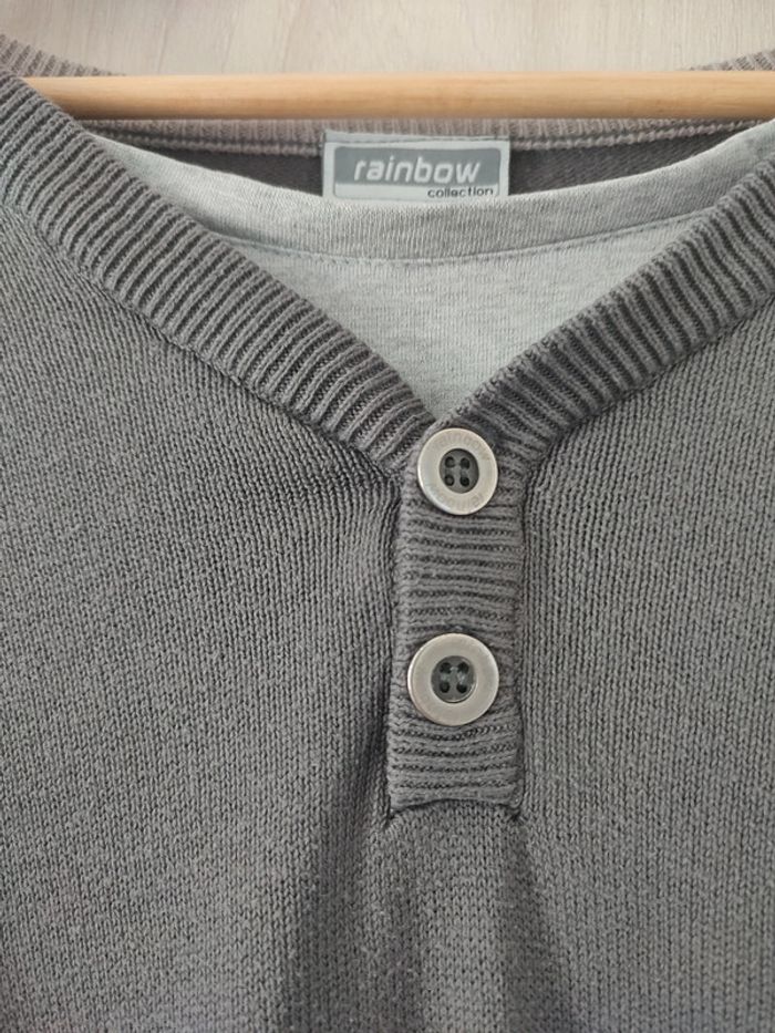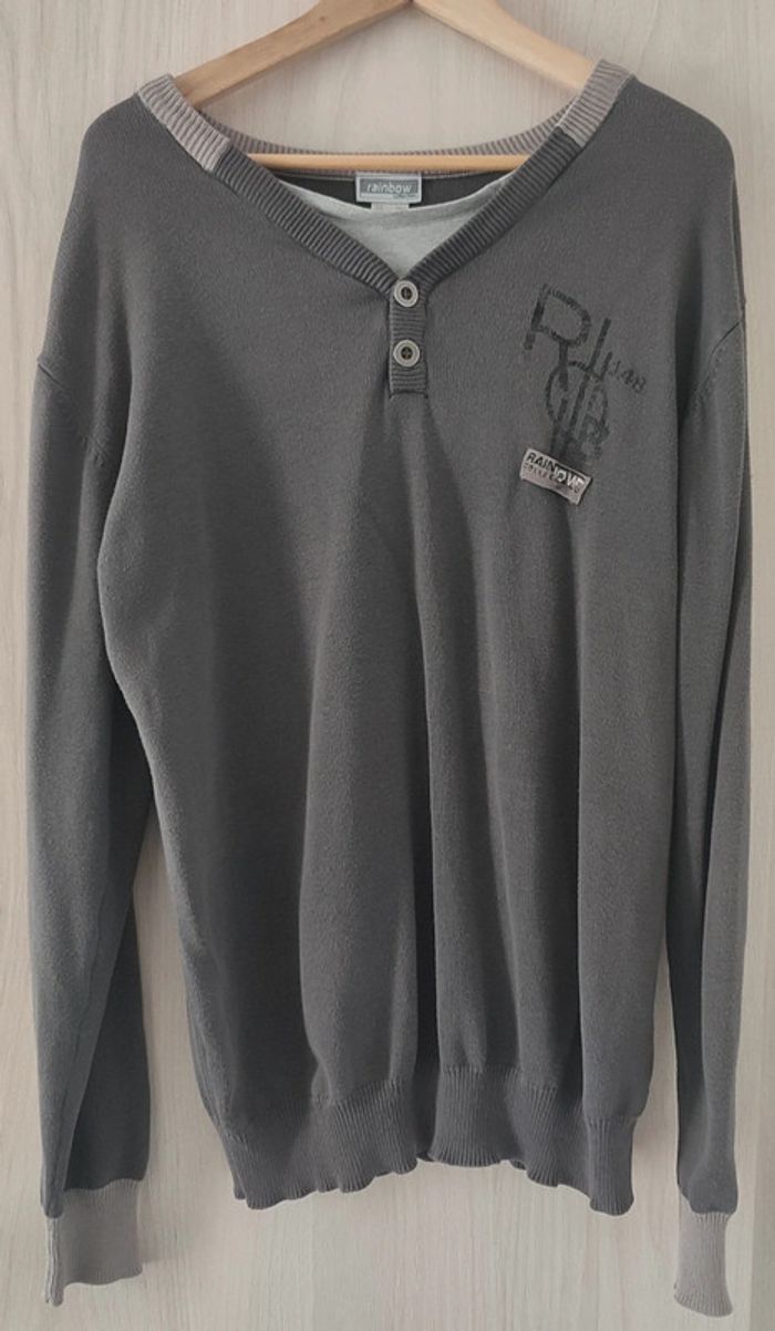Pull gris, col V avec empiècement effet t-shirt ainsi que 2 boutons. Inscription sur le côté gauche du pull (voir photos). Taille un peu plus large (correspond plus à du L), bon état.