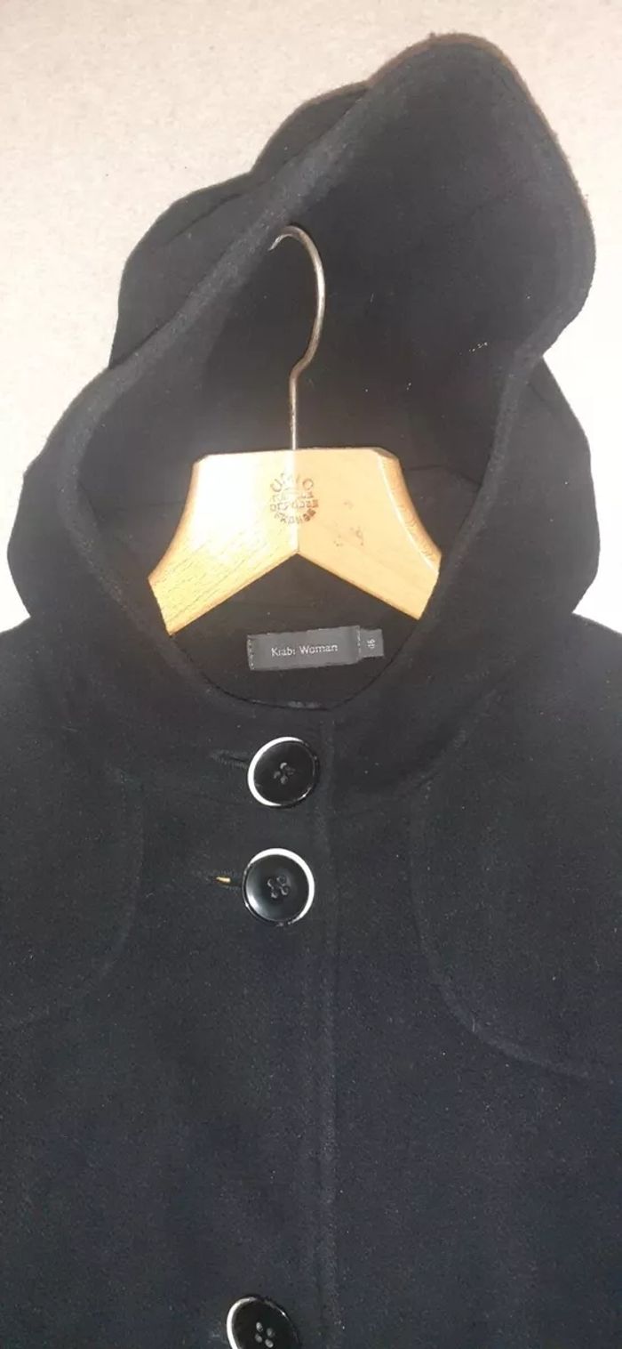 manteau femme style caban et à capuche. taille 46. noir. marque kiabi. 2 poches. tissu 20% laine et 80% polyamide. effet laineux et chaud. 3 boutons sur le haut excellent état