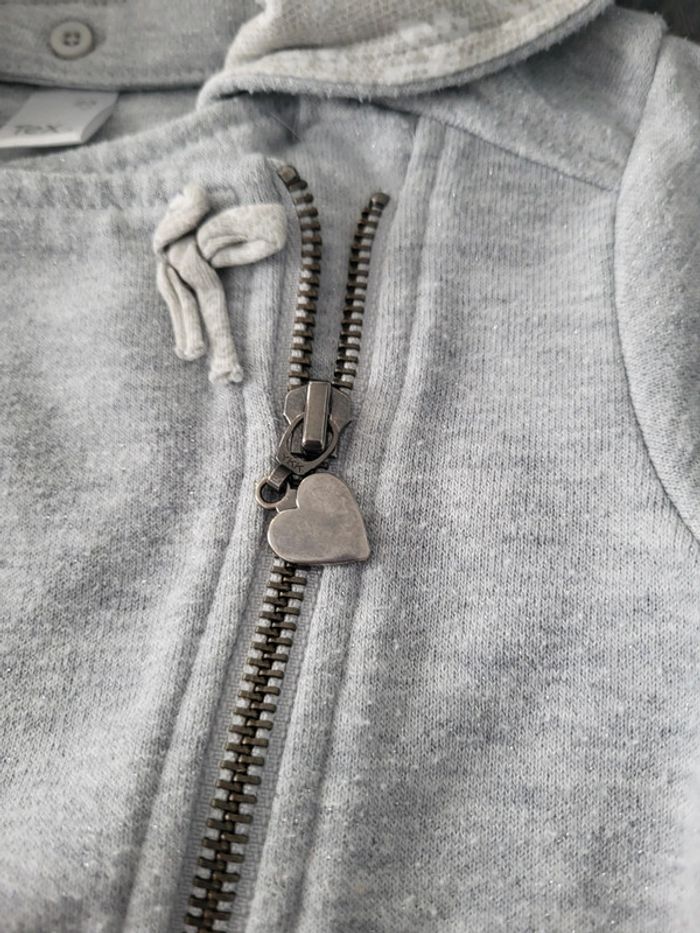 Veste à capuche grise légèrement pailleté fermeture par zip (zip avec un cœur au bout) capuche doublé grise à fleur,et qui se retirer
