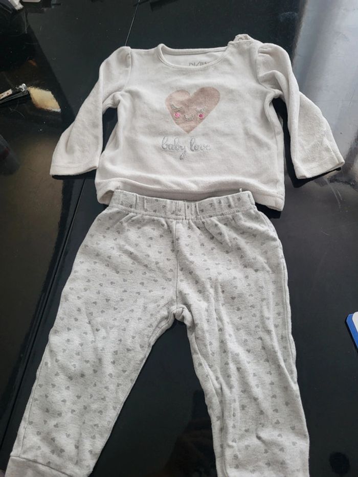 Pyjama 2 pièces bas gris petit cœur. Haut blanc cœur beige