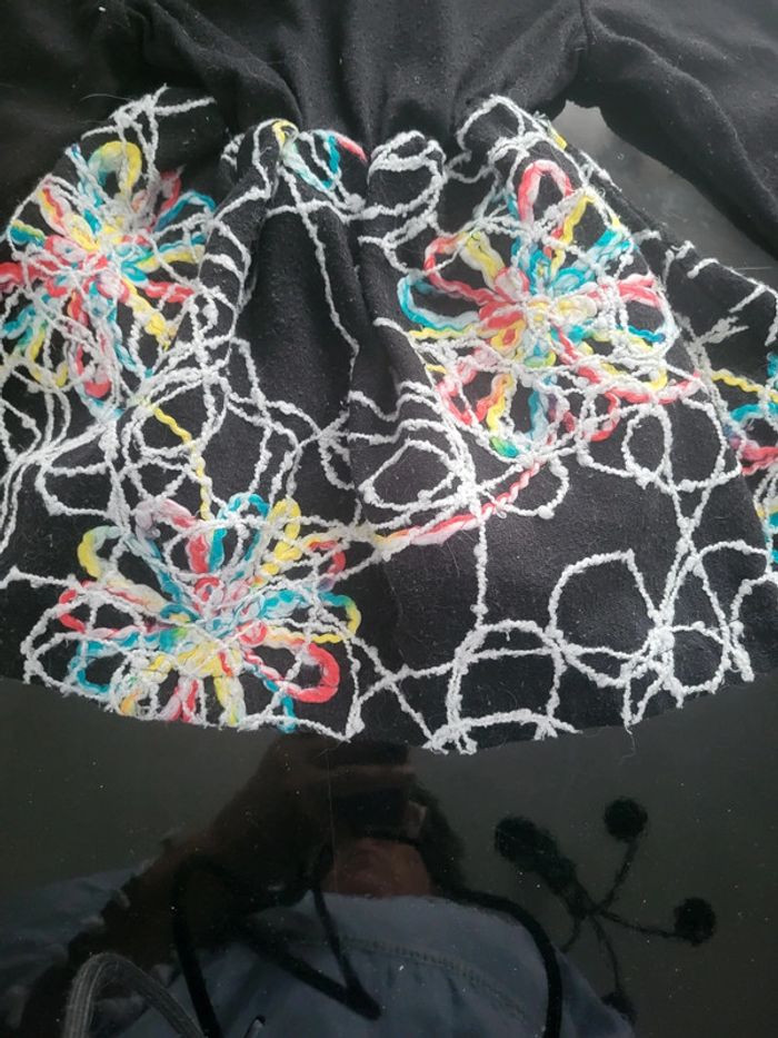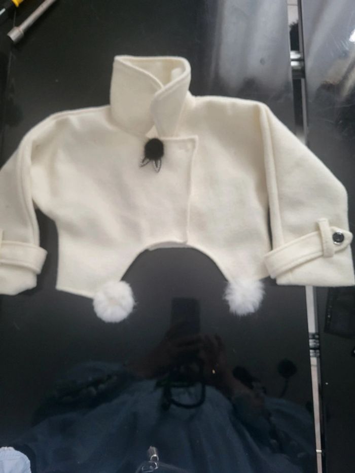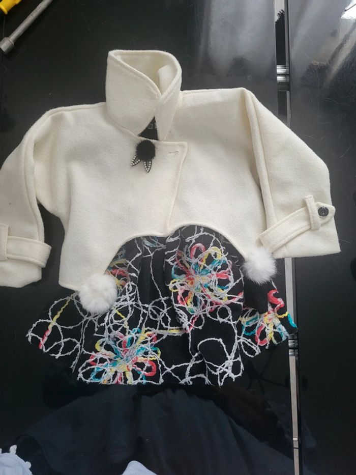 Ensemble composé d une veste ecru avec pompon blanc sur le bas, petit pompon noir avec feuille strasse, 1 gros bouton noir Et d une robe noir manche longue graphique