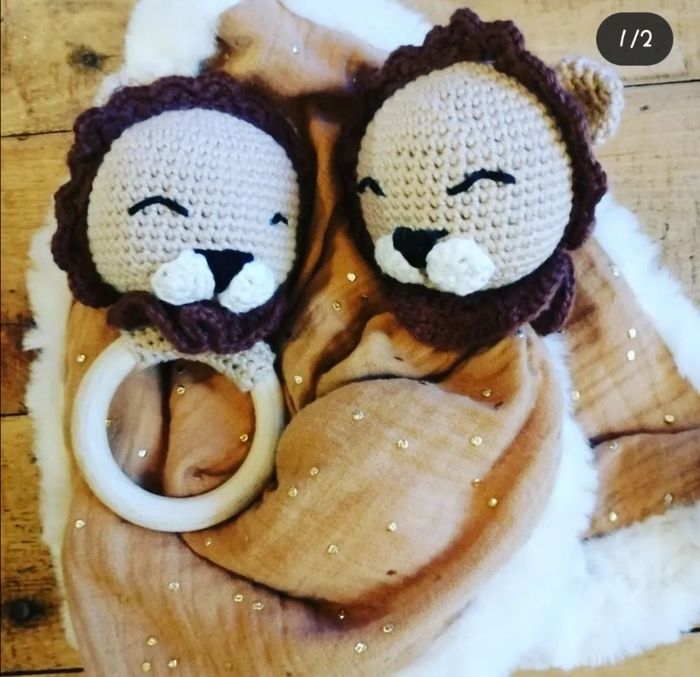 Ensemble doudou lion, tête au crochet et doudou en tissus avec doublure en polaire toutes douce 30cm sur 30cm. Accompagner de sont hochet