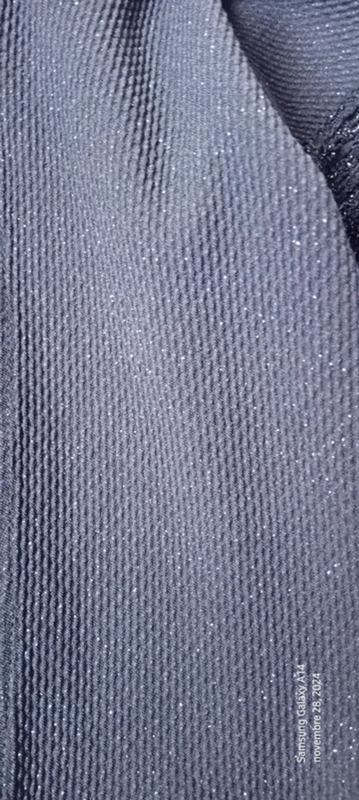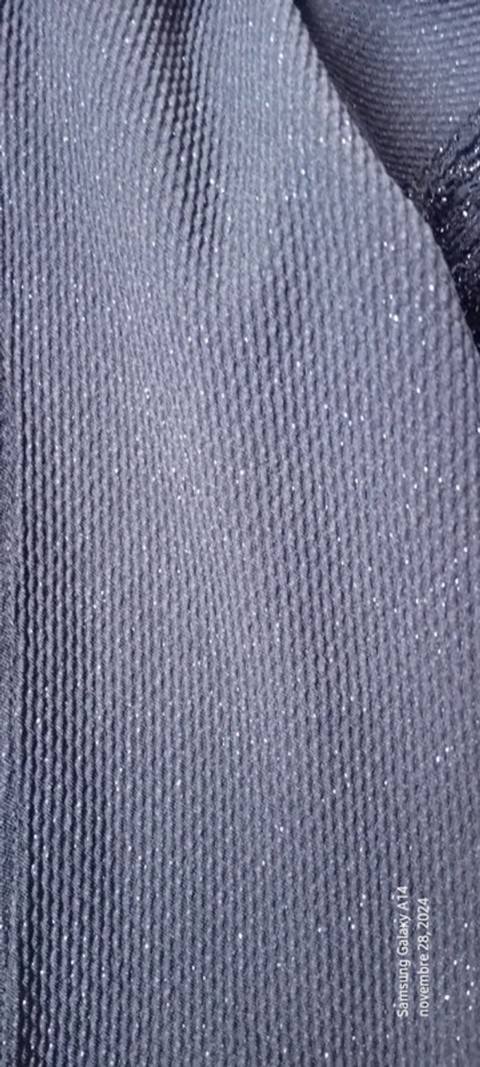 Boléro gilet Nadine en polyester elastanne et fil métallique argenté manches longues plus court devant que derrière manches aspect relief bi matière ideal pour une cérémonie ou les fêtes de fin d'année longueur devant 34 cm longueur derrière 43 cm largeur aisselles à aisselles 45 cm longueur manches 27 cm correspond à une taille 12 ans