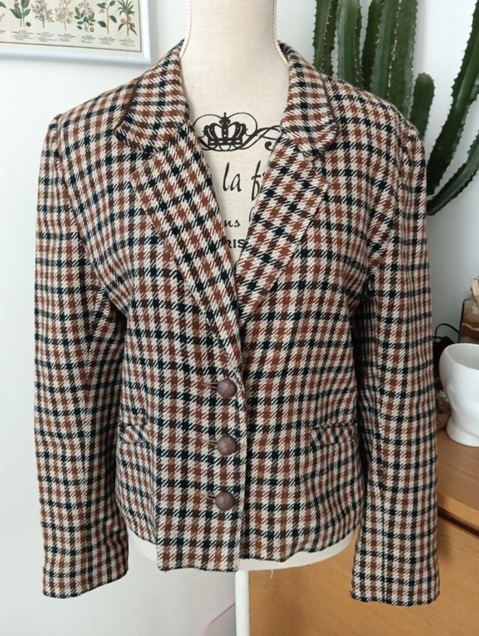 Veste à carreaux Etam vintage Coupe Spencer Plutôt légère 15%laine Taille 40 estimée à confirmer avec les mesures. Mesures Épaules 43cm Aisselles 52cm Longueur 56cm