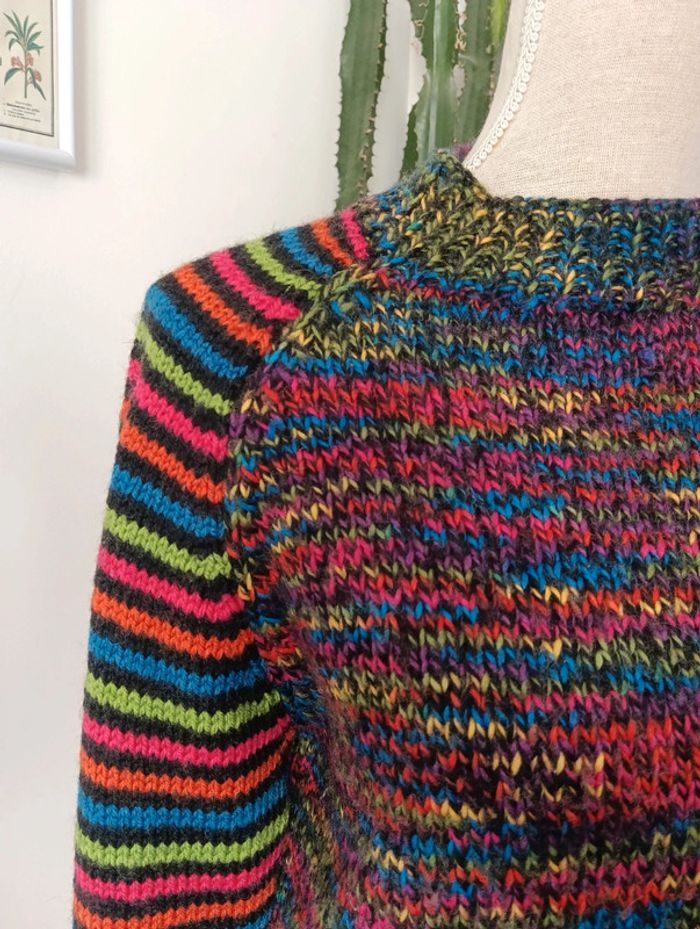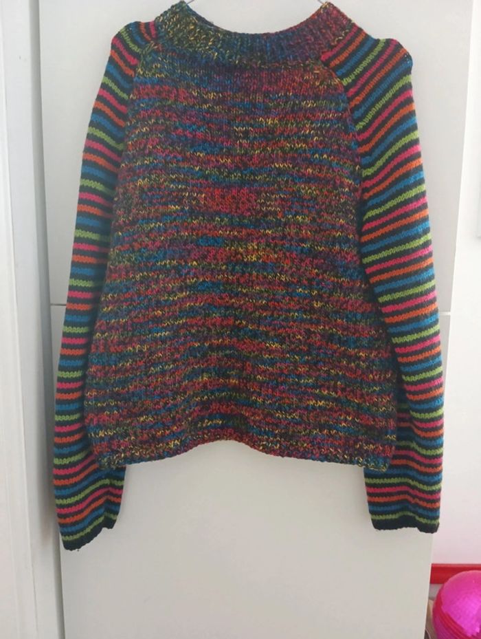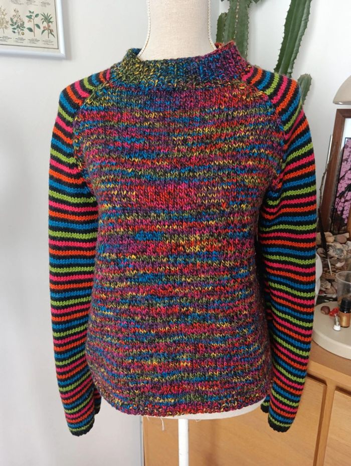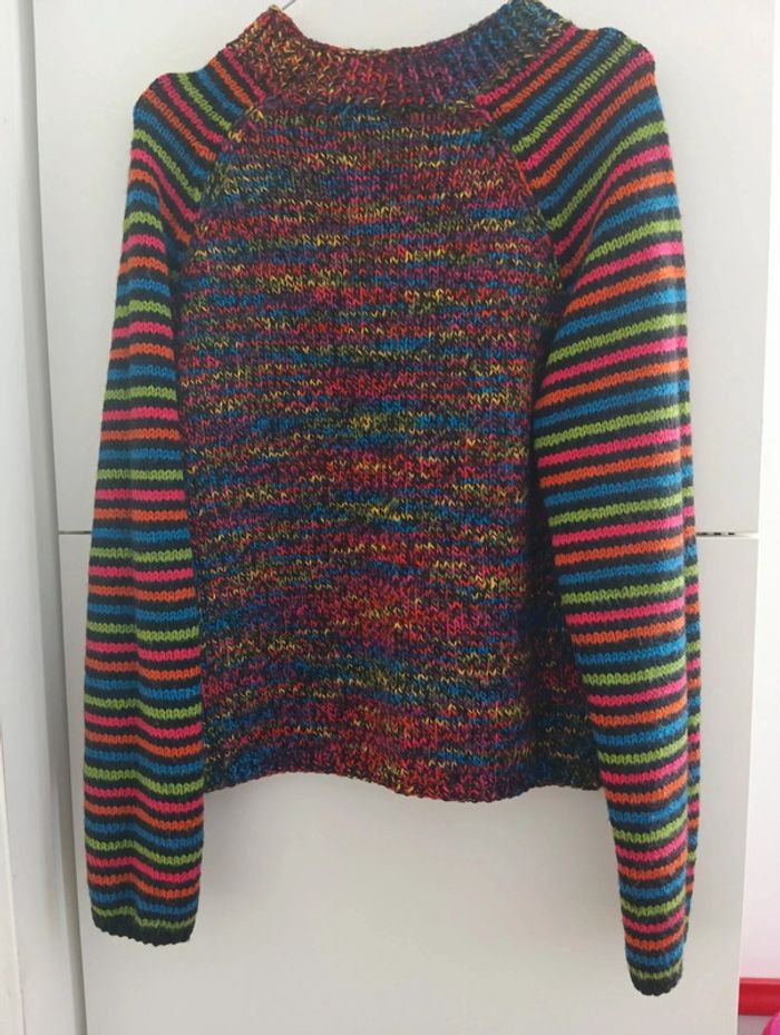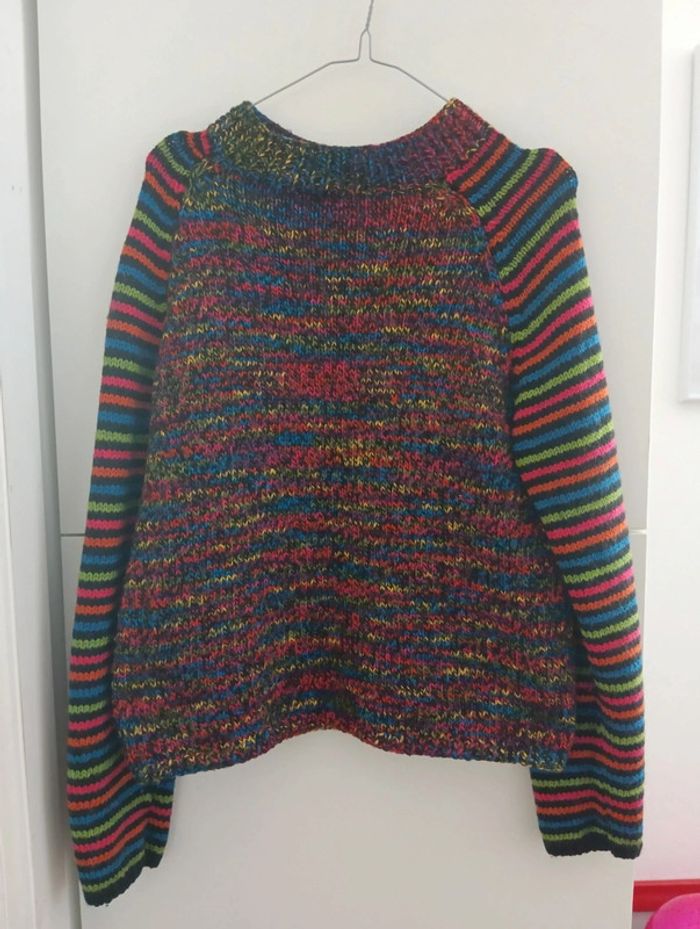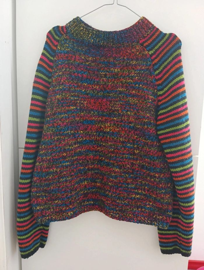 Magnifique Pull handmade/ fait main, multicolore taille M estimée Laine mélangée, Bras à rayures multicolores, Buste couleurs mélangées, Une pièce unique pour vitaminée l'hiver. Taille 38 estimée Mesures Aisselles 51cm Longueur 60cm