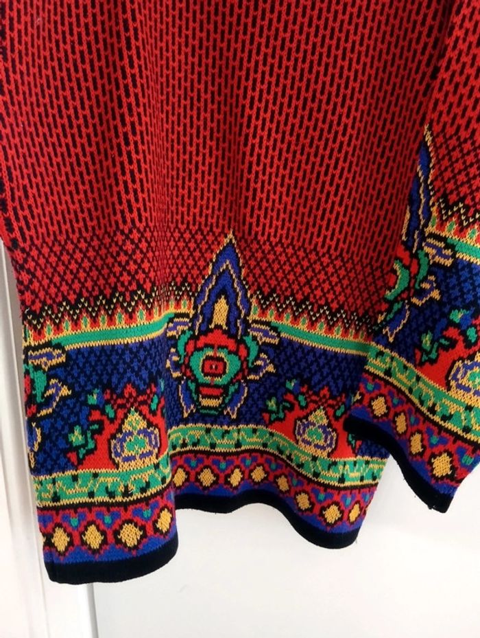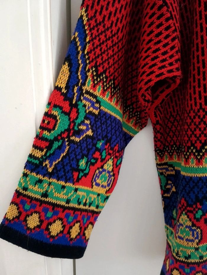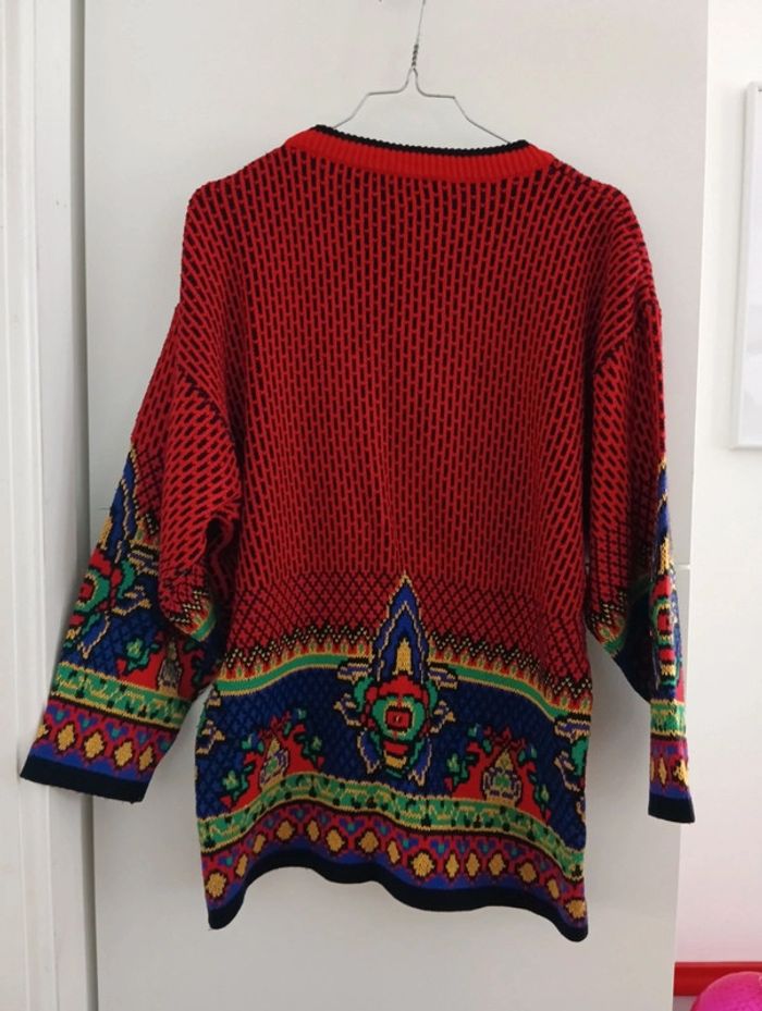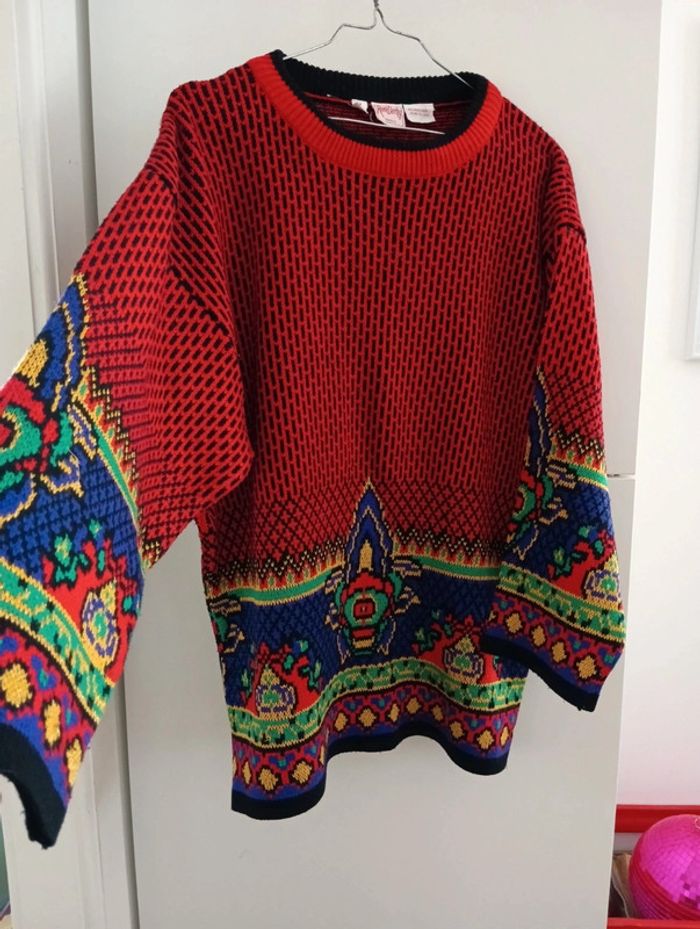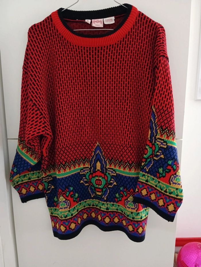 Pull Vintage René Derhy taille M/40 Coupe droite, Col rond Buste rouge et noir, Bout des manches multicolore avec fils brillants. Taille à confirmer avec les mesures selon l'effet souhaité. Epaules 58 cm Aisselles 56cm Longueur 68cm