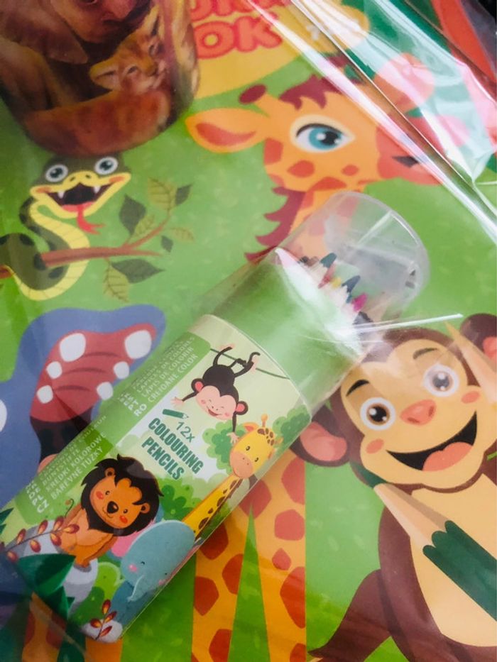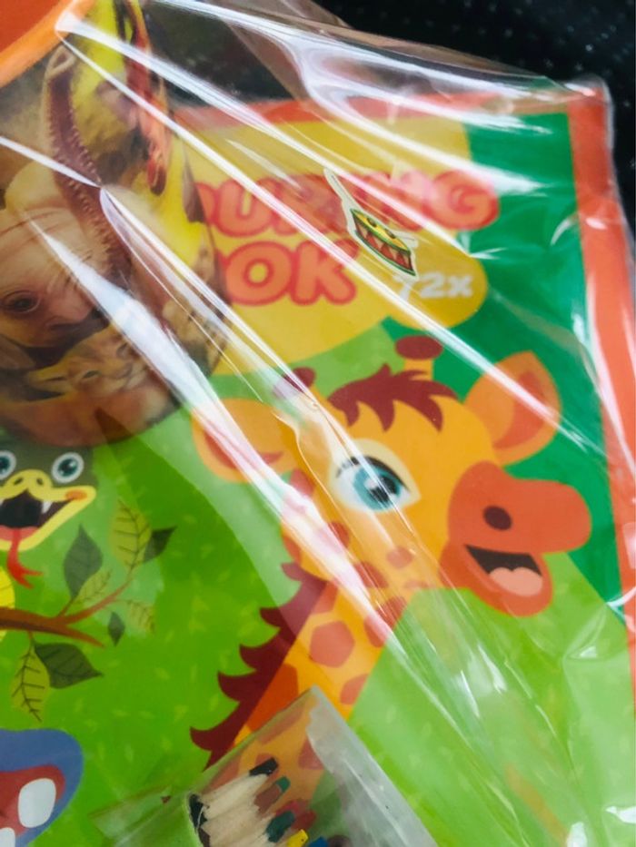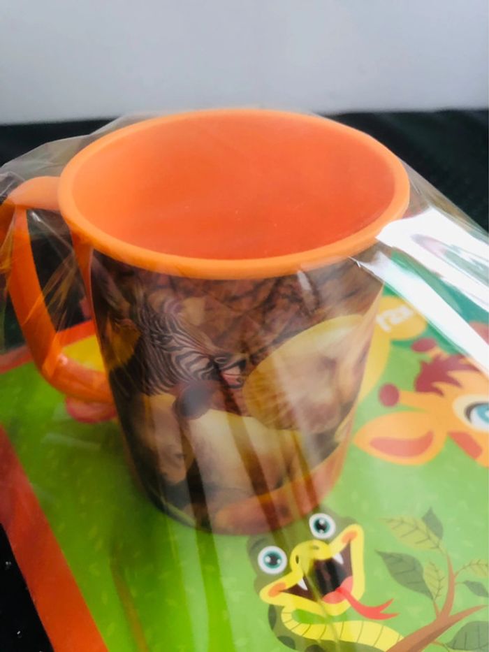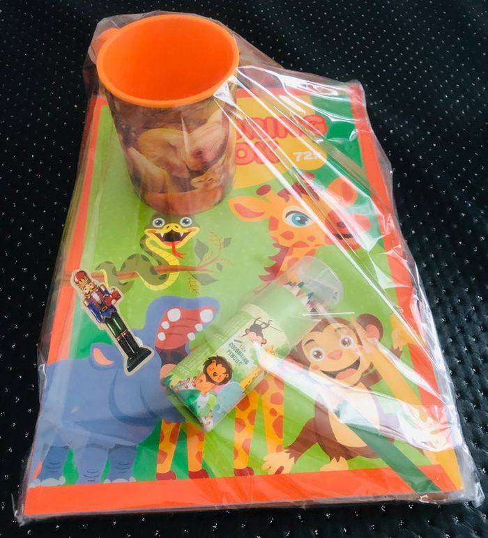 Ensemble cadeaux sur le thème de la jungle comprenant: Un mug en plastique (jamais servi) Une petite boîte de 12 crayons de couleurs. Bouchon taille crayon (neuf) Album à colorier 72 pages (neuf)