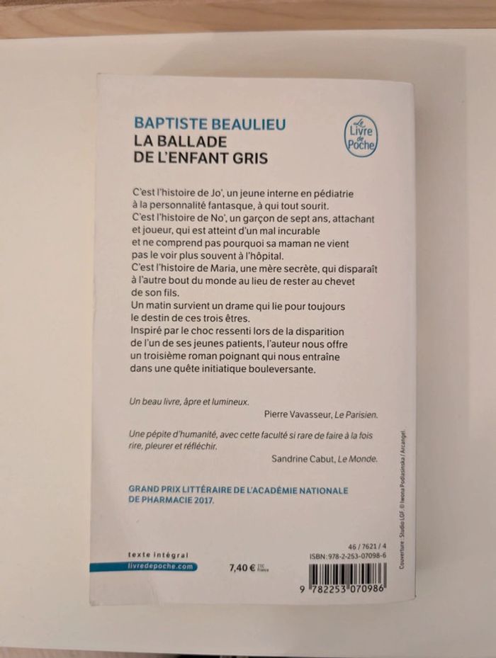 Livre de poche. Auteur : Baptiste Beaulieu. Titre : La ballade de l'enfant gris. C’est l’histoire de Jo’, jeune interne en pédiatrie à la personnalité fantasque, à qui tout sourit. C’est l’histoire de No’, un petit garçon de sept ans attachant et joueur, qui est atteint d’un mal incurable et ne comprend pas pourquoi sa maman ne vient pas plus souvent le voir à l’hôpital. C’est l’histoire de Maria, une mère secrète, qui disparaît à l’autre bout du monde au lieu de rester au chevet de son fils. Un matin, dans la chambre de l’enfant, survient un drame qui lie à jamais le destin de ces trois êtres. Jo’ devra tout quitter pour partir sur les traces de Maria et percer ses mystères. Inspiré par le choc ressenti lors de la disparition de l’un de ses jeunes patients, l’auteur livre une quête initiatique et poétique, semée de recoins obscurs qui s’illuminent. Un magnifique troisième roman, porté par des personnages profondément humains. Très bon état. #tennyteblivres