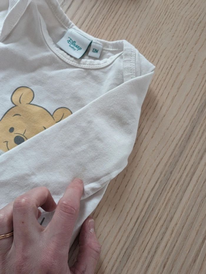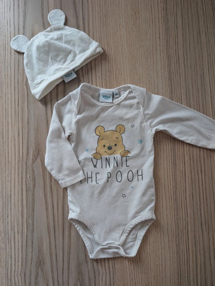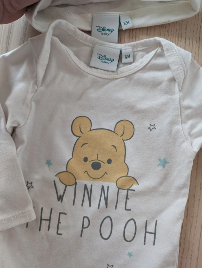 Bodie et bonnet Winnie l'ourson. Marque Disney Baby Taille 12mois. Etat satisfaisant plusieurs tâches sur la manche gauche et quelques tâches discrètes au-dessus de Winnie. Tout est visible en photos. #tennyteb12mois