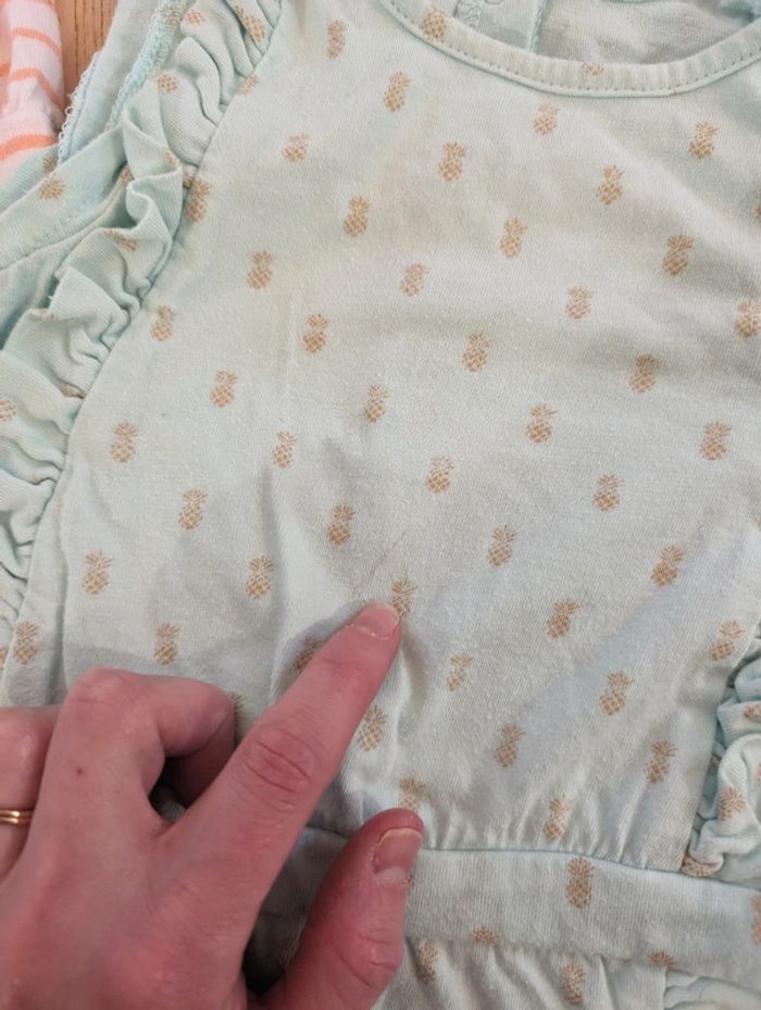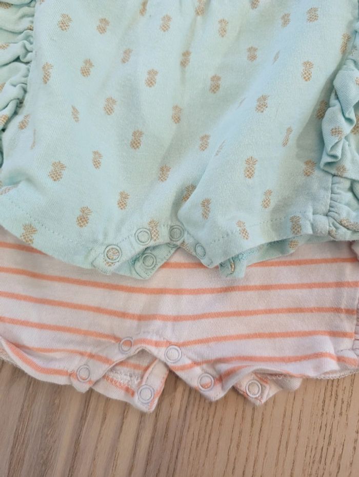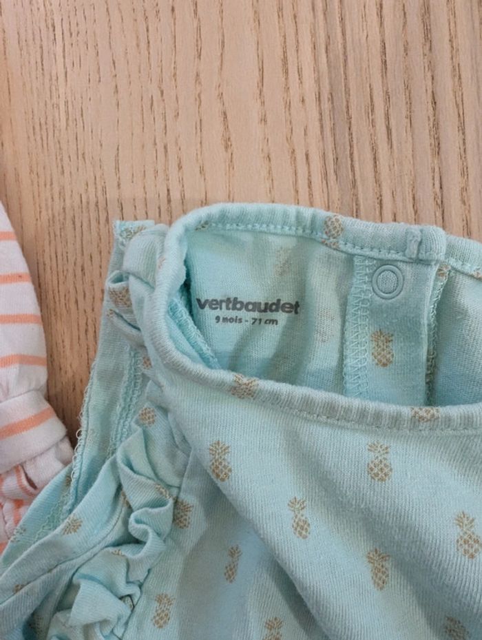Lot de 2 Combishorts avec boutons pression sur le bas pour le change. Marque Vertbaudet Taille 9mois / 71cm. État satisfaisant déjà porté plusieurs fois et dessus chaque combishort petite tâche visibles comme sur les 2 dernières photos. Petit prix #tennyteb9mois