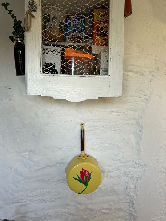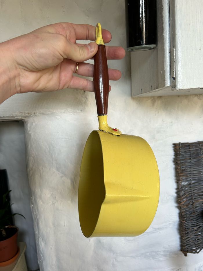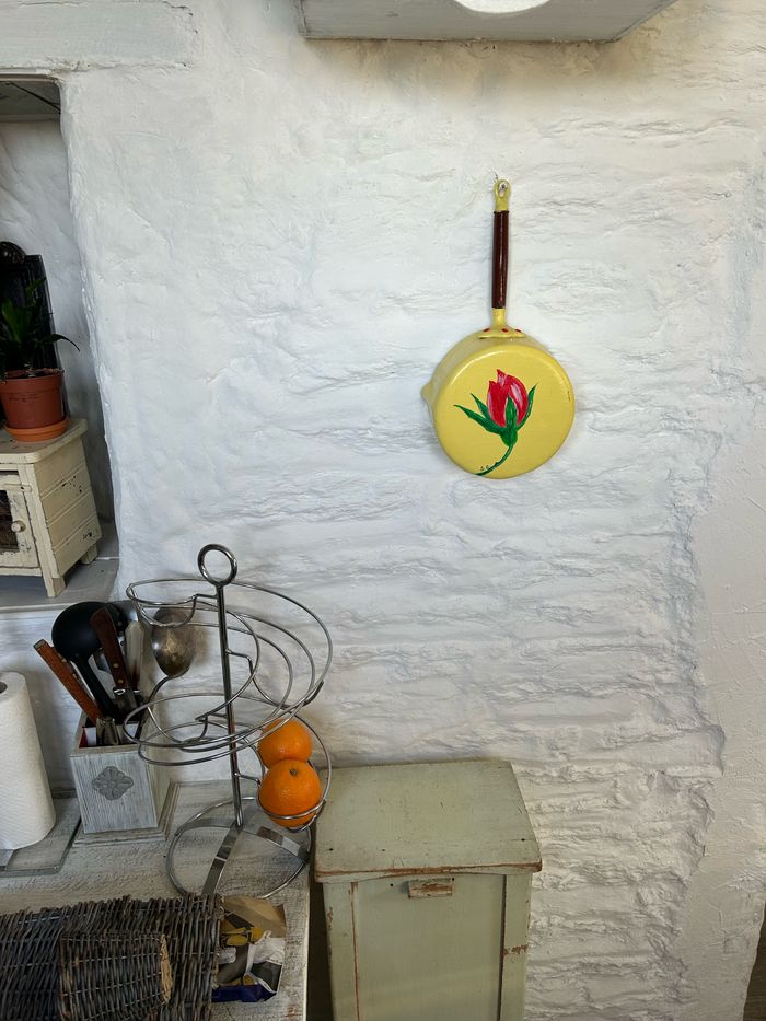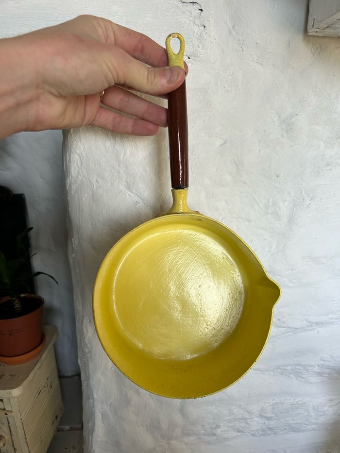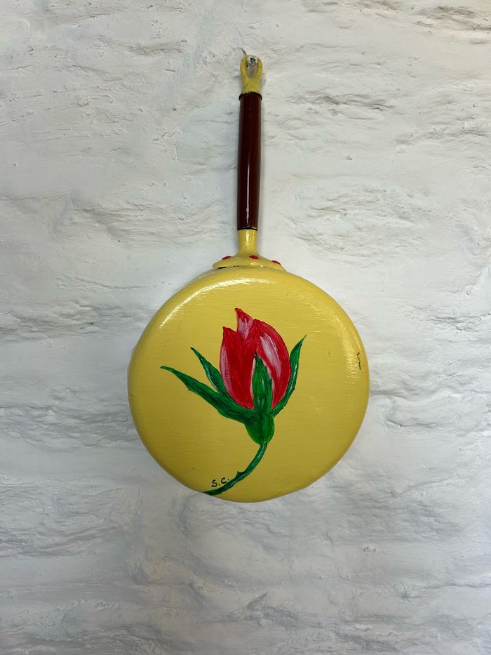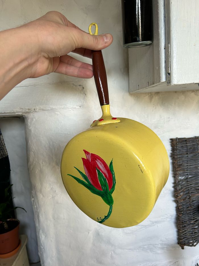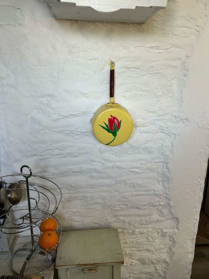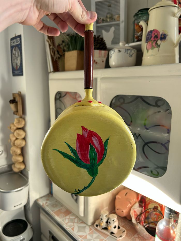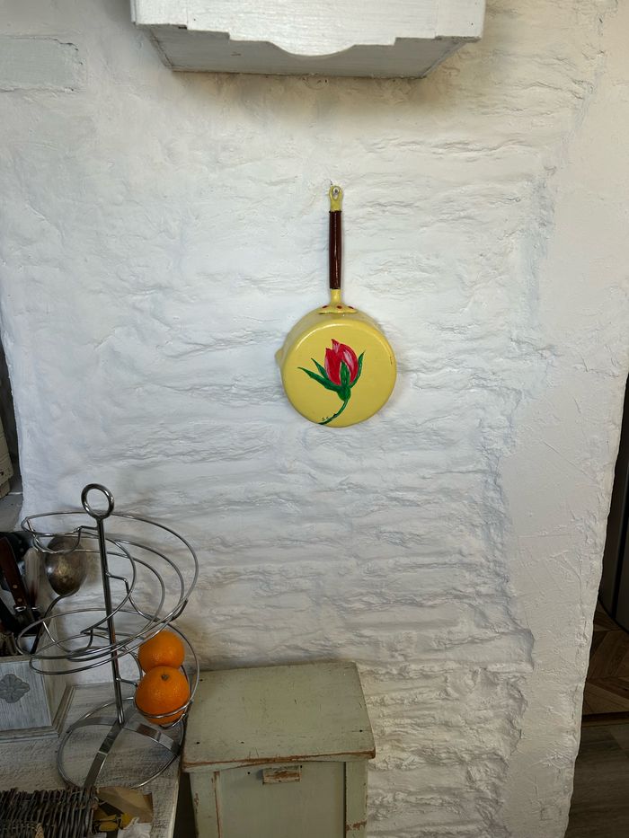 Superbe suspension casserole art populaire peinte des années 1950. Très sympa en déco dans une cuisine sur un mur en pierre par exemple. Envoi soigné et rapide.