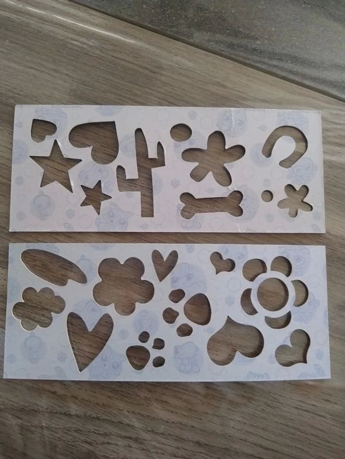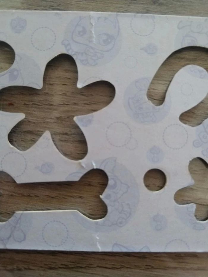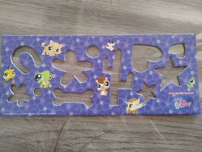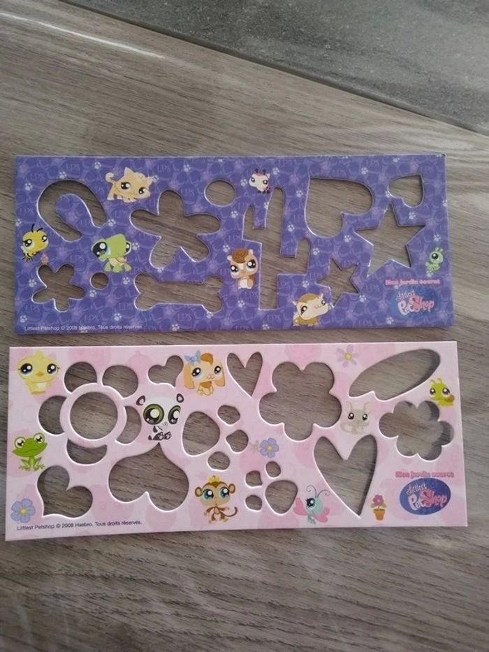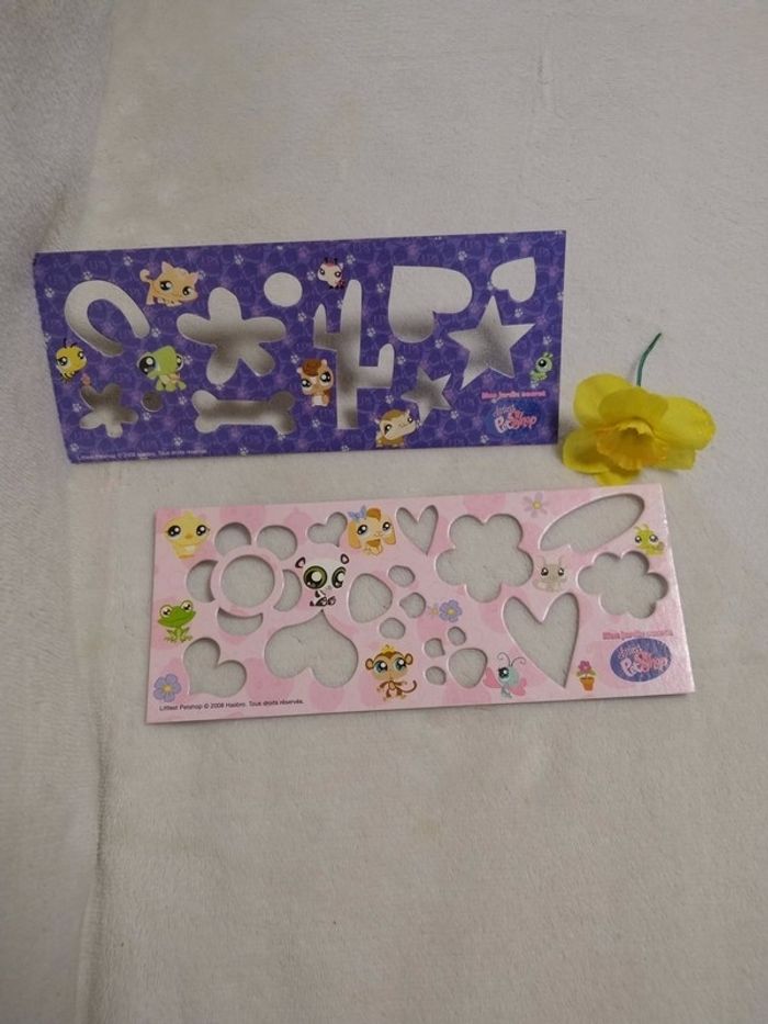 2 pochoirs Littlest Petshop Mon jardin secret Hasbro, 2008 • Différentes formes : cœur, fleur, patte, cactus, étoile, os... • Coloris rose pâle et violet avec les Petshop en photo dessus • Petite pliure sur un pochoir Neufs, jamais utilisés #evelyne_jeux