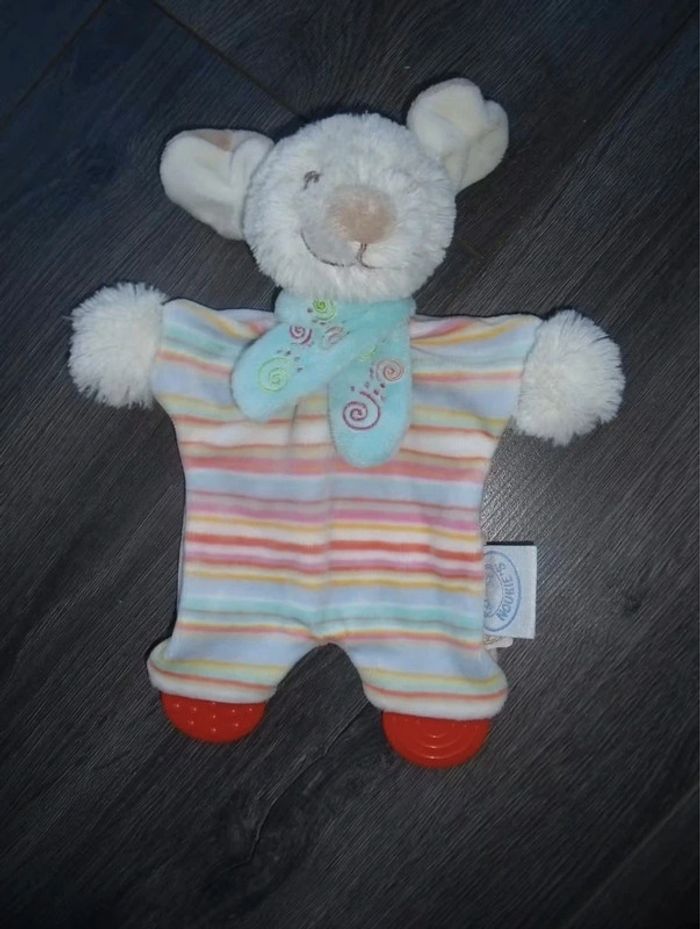 Souris doudou plat dentition Noukie's rayé écharpe bleue