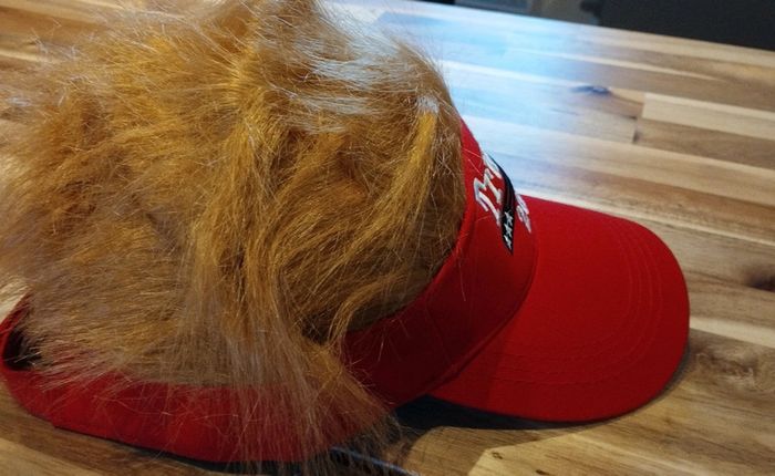 Casquette rouge emballée Trump 2024 avec fausse moumoute rousse sur le dessus
