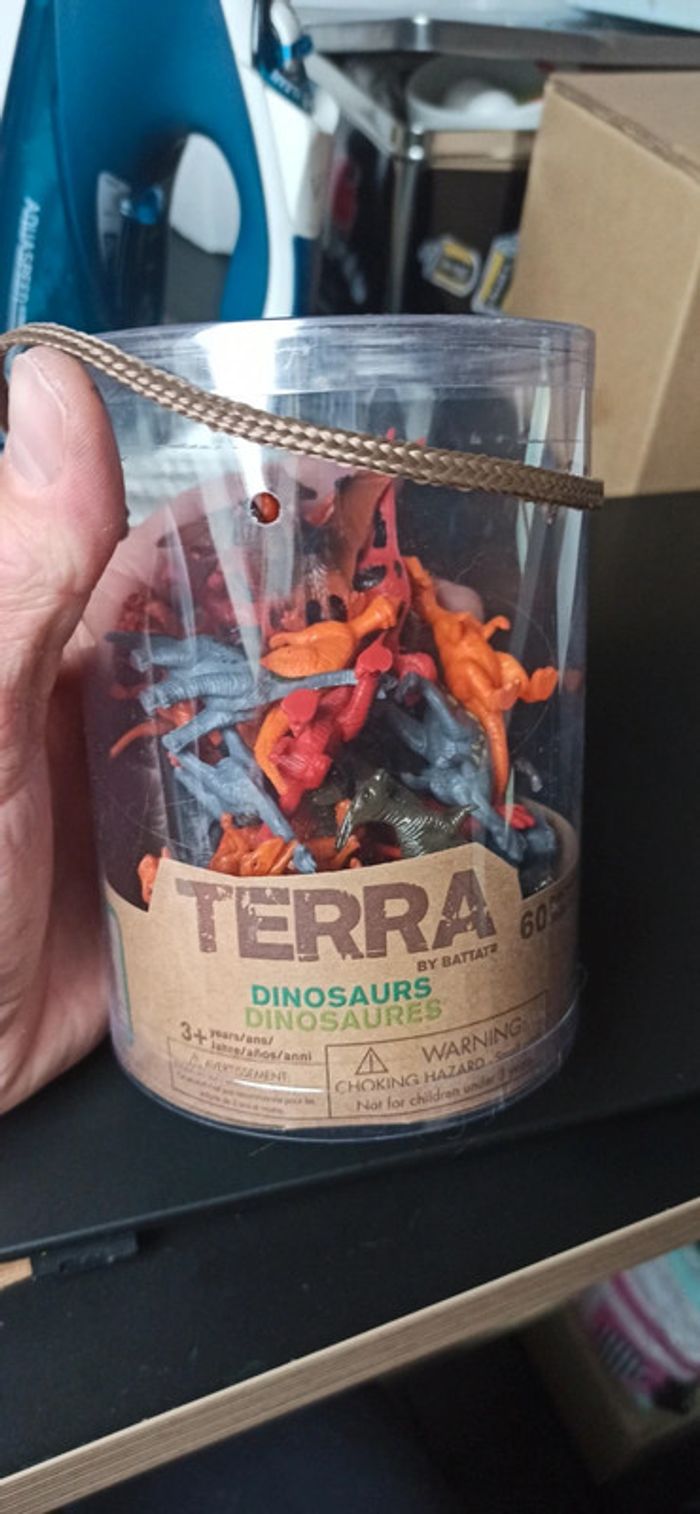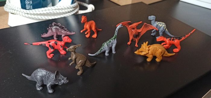 Environ 9-10 différents, 39 figurines de dinosaures en tout Neuf J'ai utilisé le reste pour un anniversaire surprise en pêche canard Si vous voulez faire un anniversaire à thème dinosaures regardez mon dressing je revends tout plein d'accessoires festifs (figurines ballons pailles chapeaux etc etc)