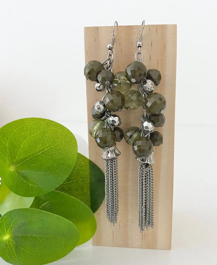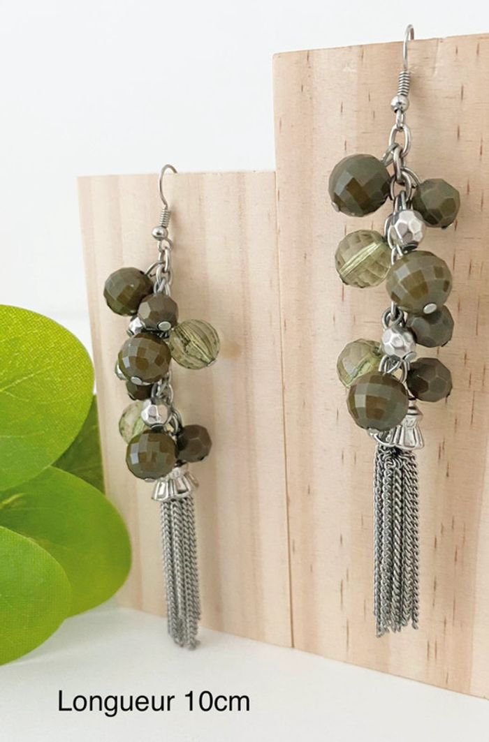 🩶 Boucles d’oreilles vert Kaki 💚 boules et Chaînettes - Vintage - excellent état - photo numéro 2