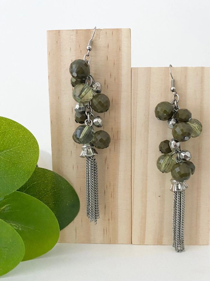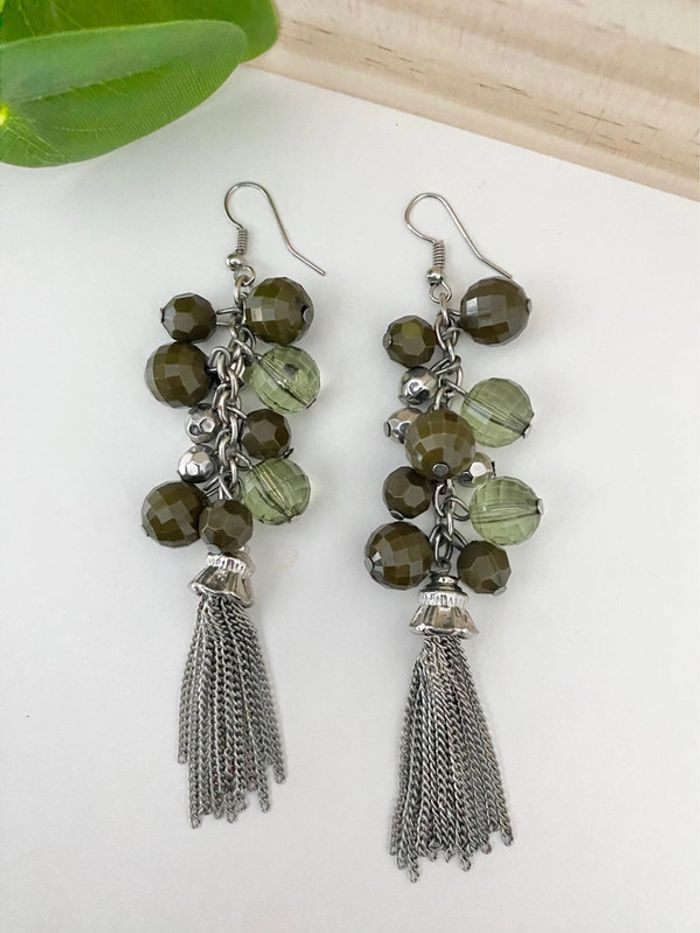🩶 Boucles d’oreilles vert Kaki 💚 boules et Chaînettes - Vintage - excellent état - photo numéro 1