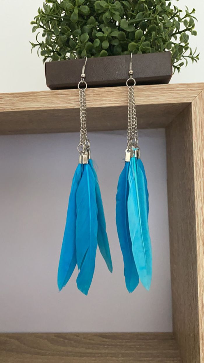 boucles d’oreilles neuves jamais portées plumes turquoises chaînettes argentées boucles légères longueur 13cm (plume 8cm) attache acier chirurgical N’hésitez pas à faire un lot pour économiser sur les frais Vinted 👛🌎 Pour voir toutes mes boucles d’oreilles disponibles c’est par ici 👇🏼 #gegebouclesmode 📦 Envoi rapide et soigné 🏠 Non fumeur et sans animaux ✍🏻 Envoyez moi un message si vous avez des questions, je réponds dans la journée #creoles #perles #doré #argenté #bijou #chaine #anneau #goutte #plume #metal #pierre #tendance #mode #boheme #fashion #neuf #motif #forme #géométrique #cercle #ronde #chic #élégant
