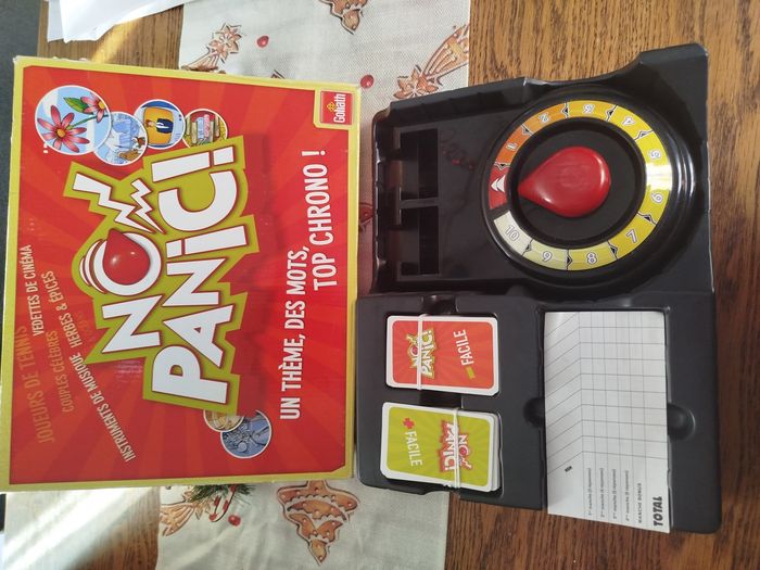 Jeu en très bon état et complet Je no panique un jeu d'ambiance familiale au rythme infernal ! Avec des cartes de deux niveaux de difficultés pour que petit est grand et les mêmes chances de gagner.