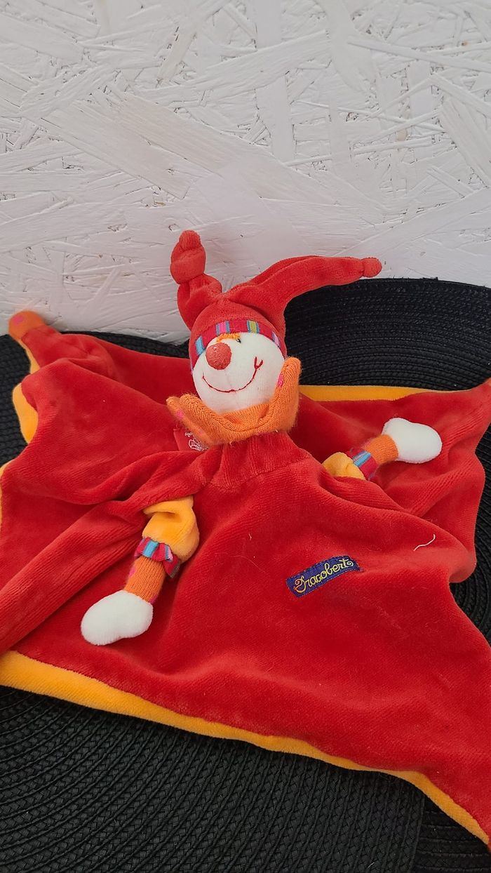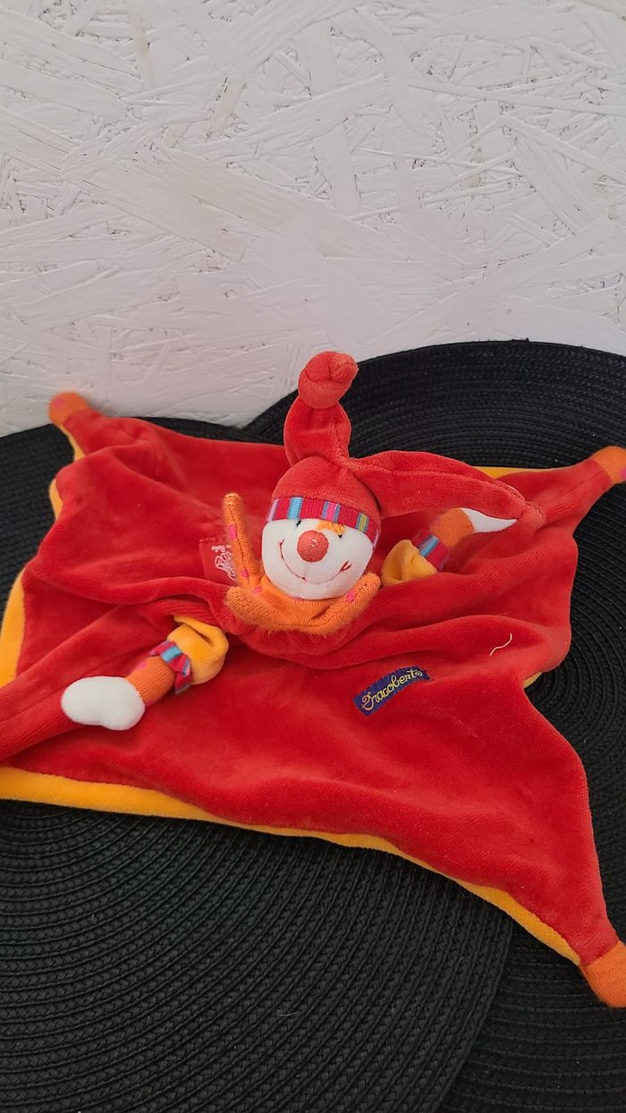 Doudou plat Capucin Dragobert MOULIN ROTY clown arlequin rouge orange