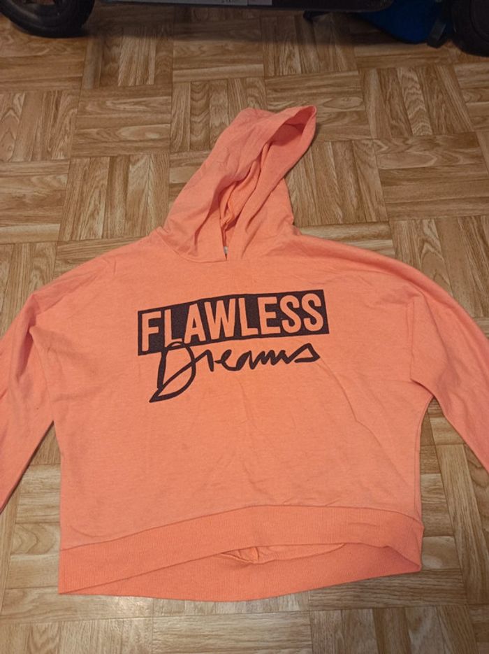 Pull court fille Gémo taille 12 ans en bon état ⚠️la couleur ne se voit pas bien sur les photos, il est orange/rose fluo Il présente quelques tâches (voir toutes les photos) Peluches sur l'ensemble du pull