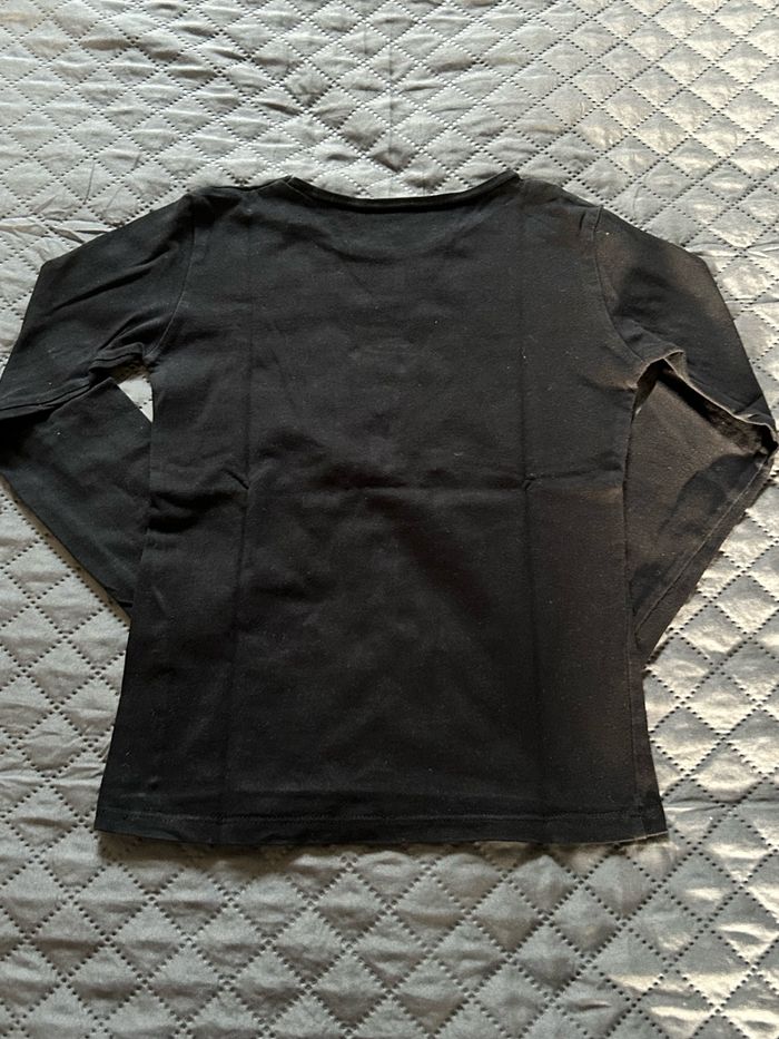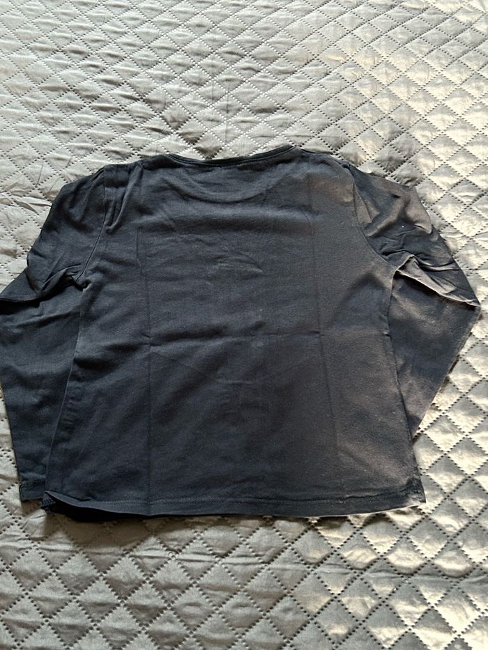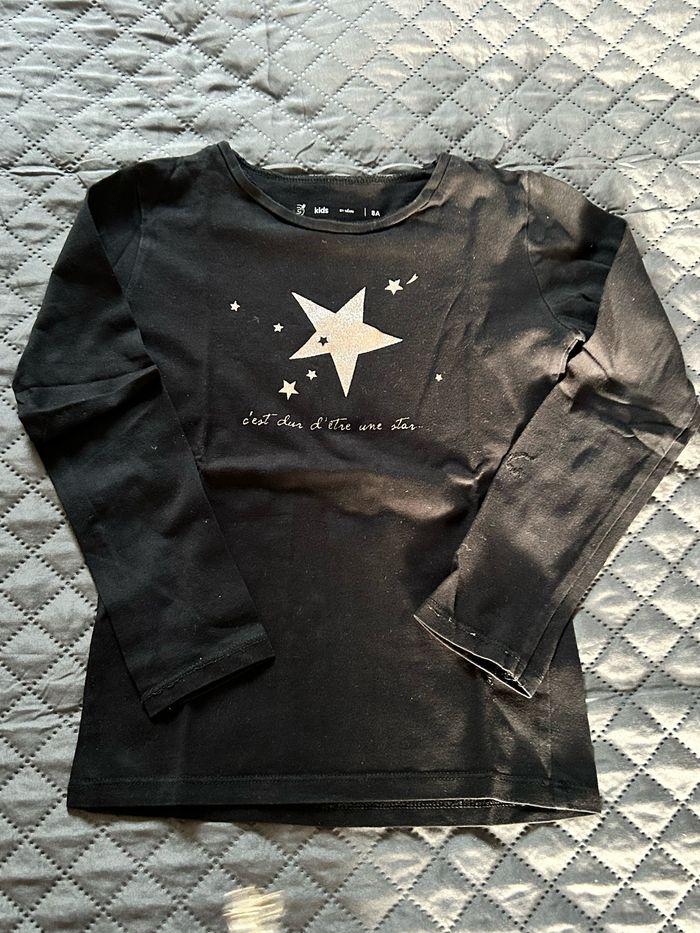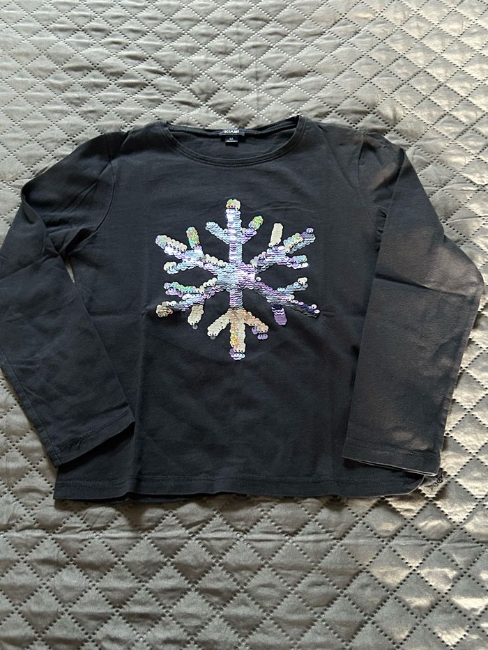 Lot de 2 t-shirts manches longues taille 8 ans avec motifs fête. -1 bleu marine avec motif flocon à sequins changeants de couleurs de la marque Kiabi. -1 noir avec motifs étoiles argentés de la marque Gemo. En très bon état.