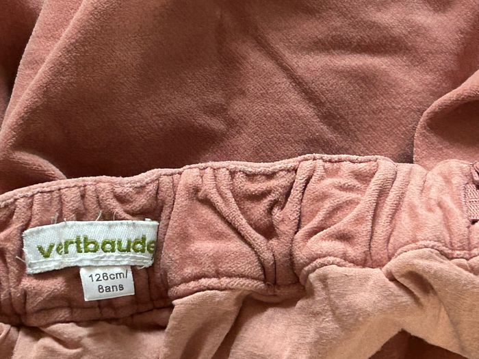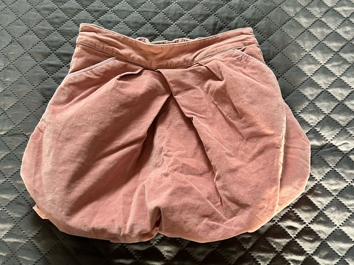 Jolie petite jupe en velours très ra couleur rose poudré. Hauteur au-dessus de genou. Taille 8 ans de la marque Vertbaudet. Forme jupe boule, élastique à la taille pour bien ajuster. Petit liserai doré aux 2 poches sur les côtés. En très bon état.