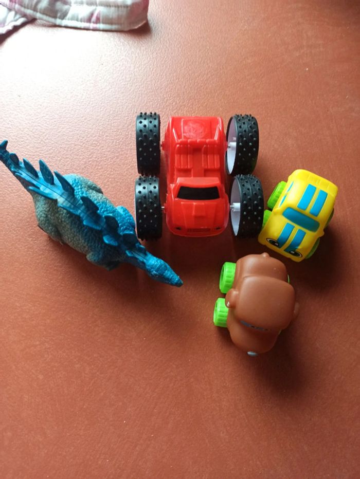 Dinosaure avec roues et 3 petites voitures
