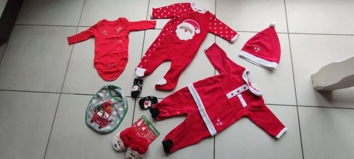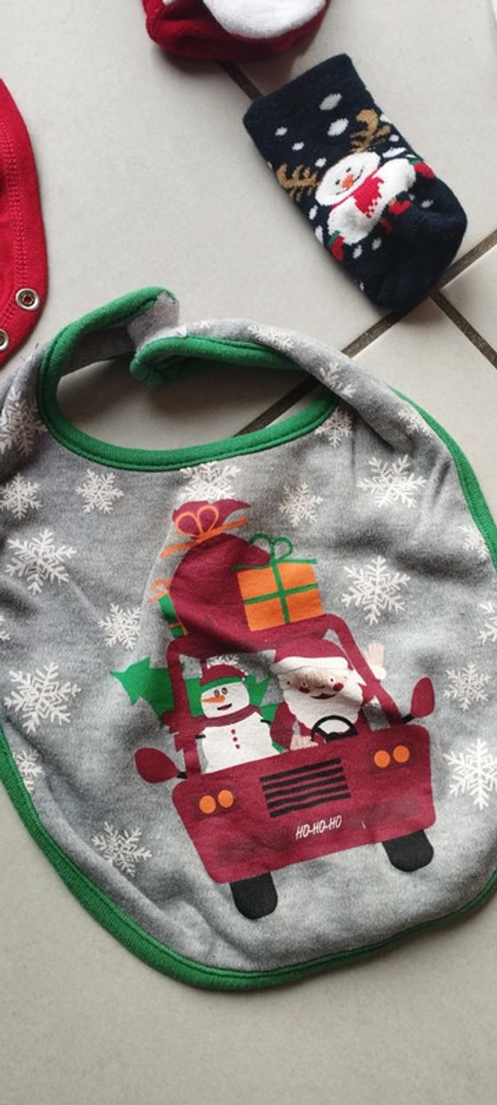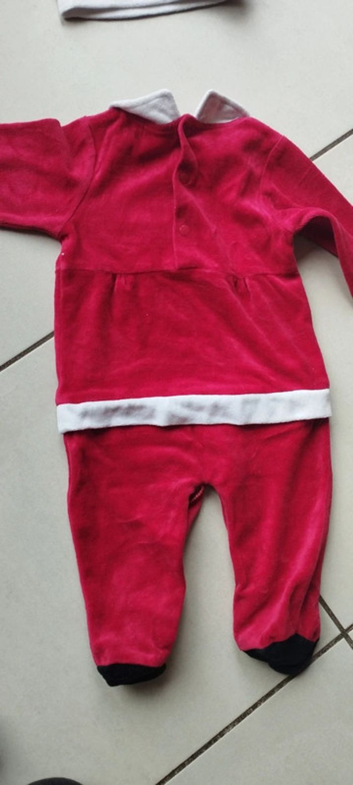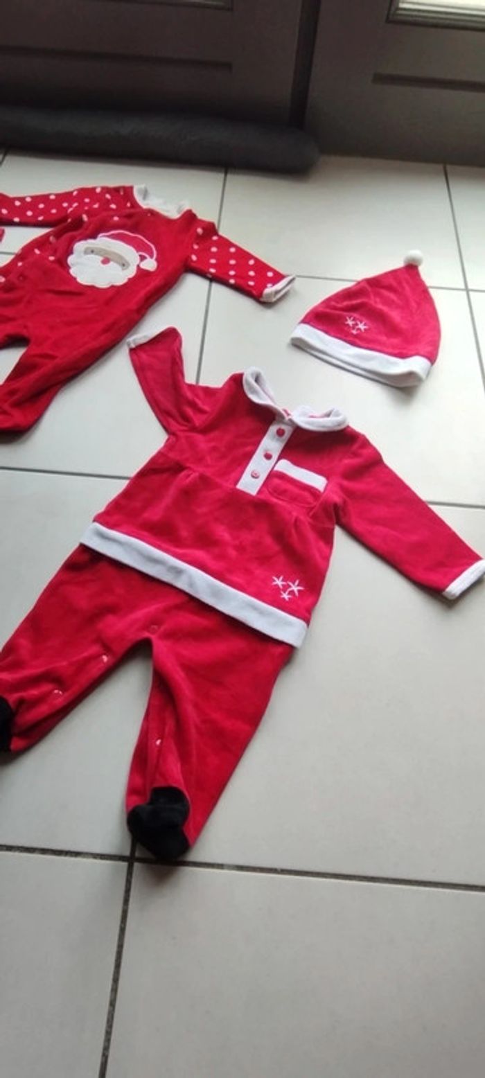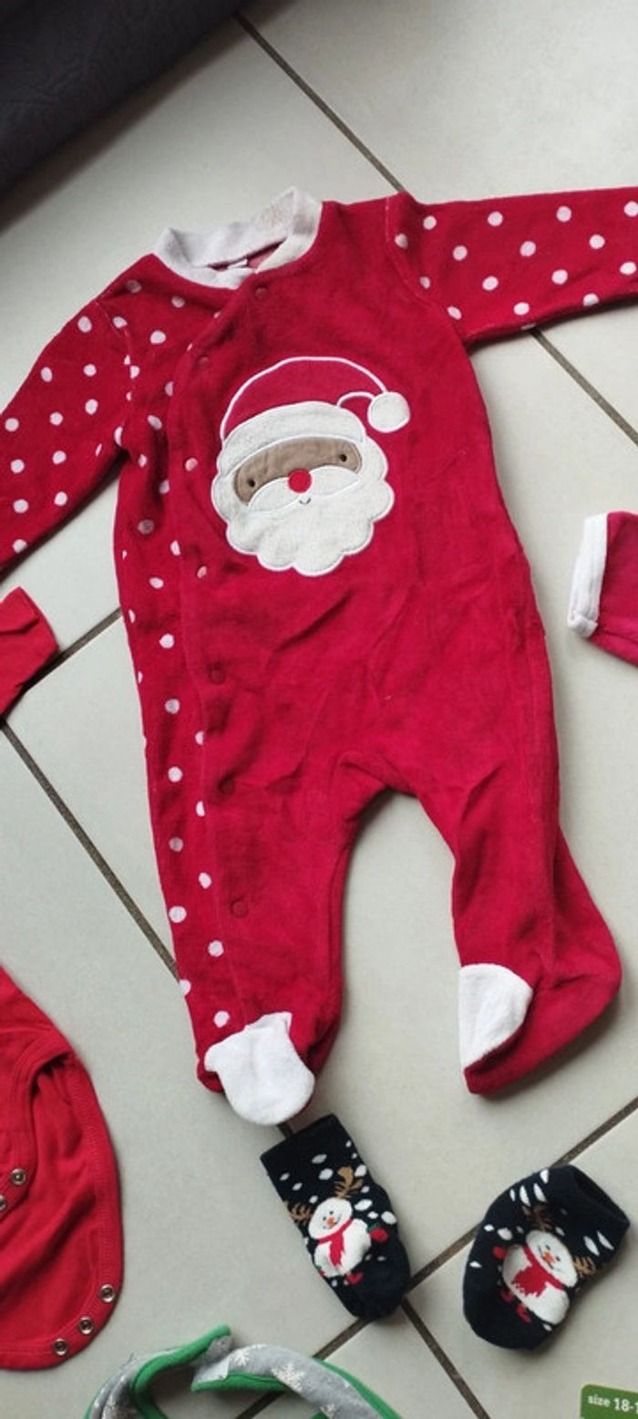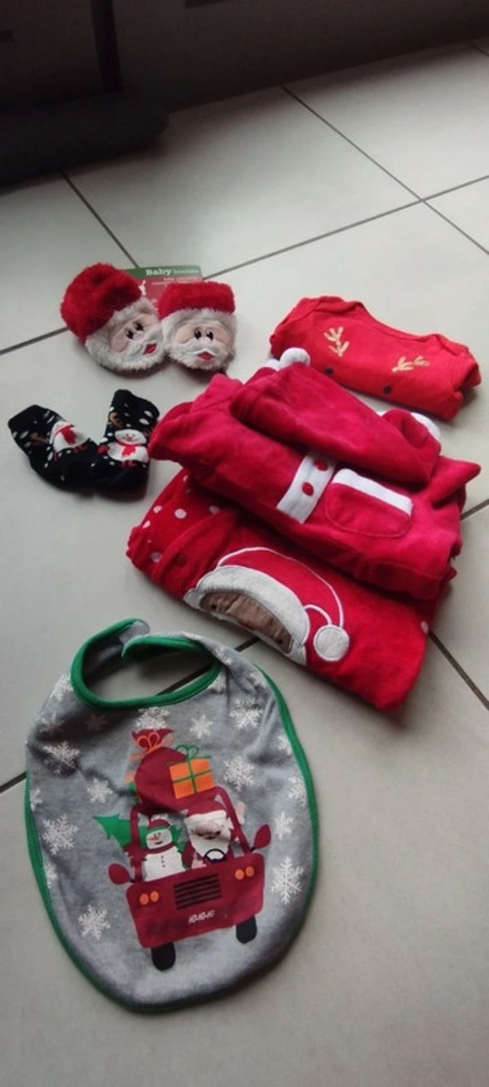 Lot d'habits de Noël en 6 mois 2 Pyjamas (porté une fois) dont un avec son bonnet assorti; 1 Bodie manches longues; 1 paire de chaussons (neufs) 1 paires de chaussettes (neuves) Un bavoir.