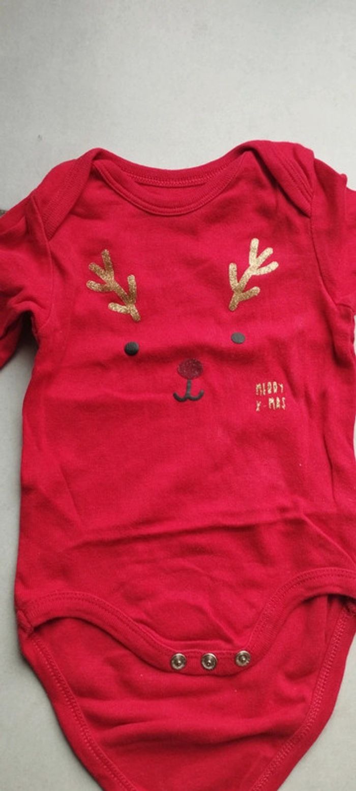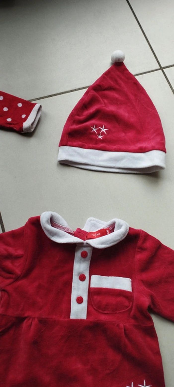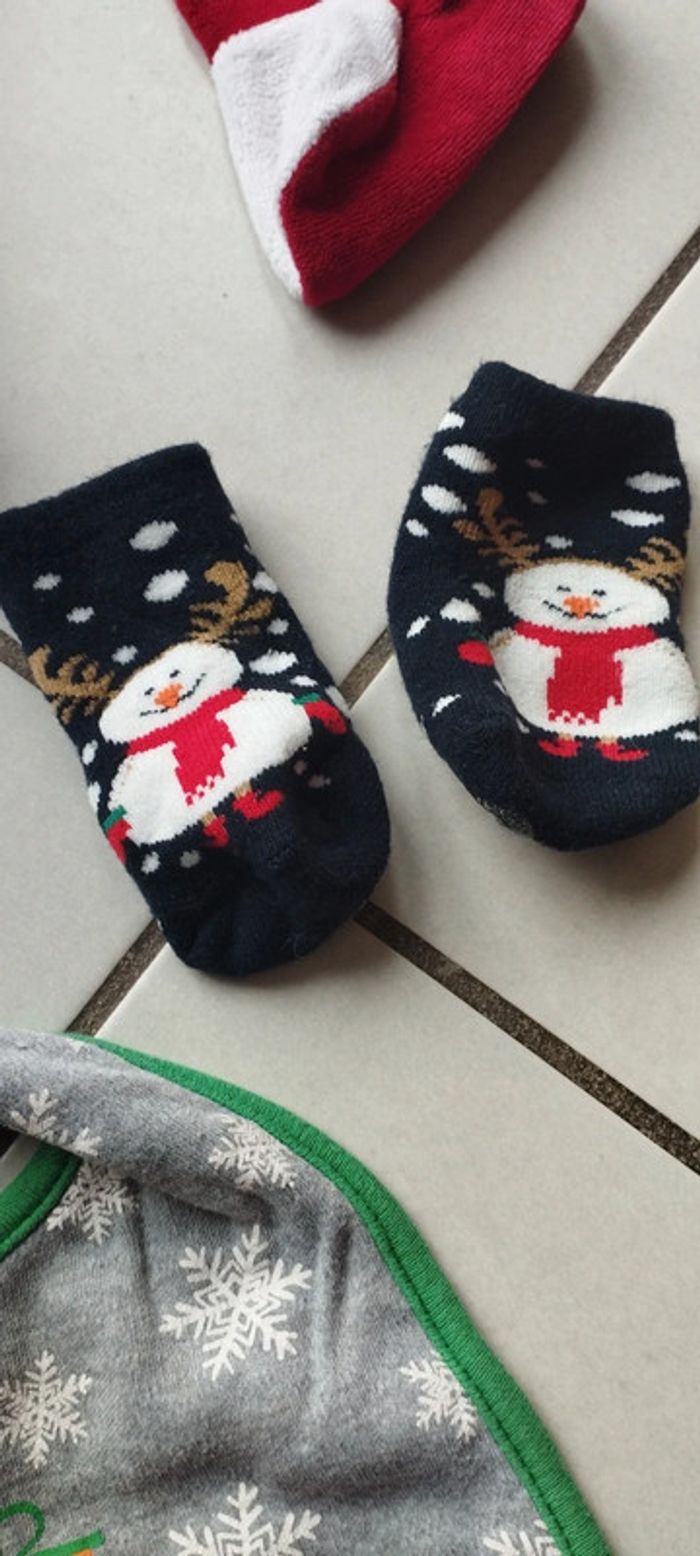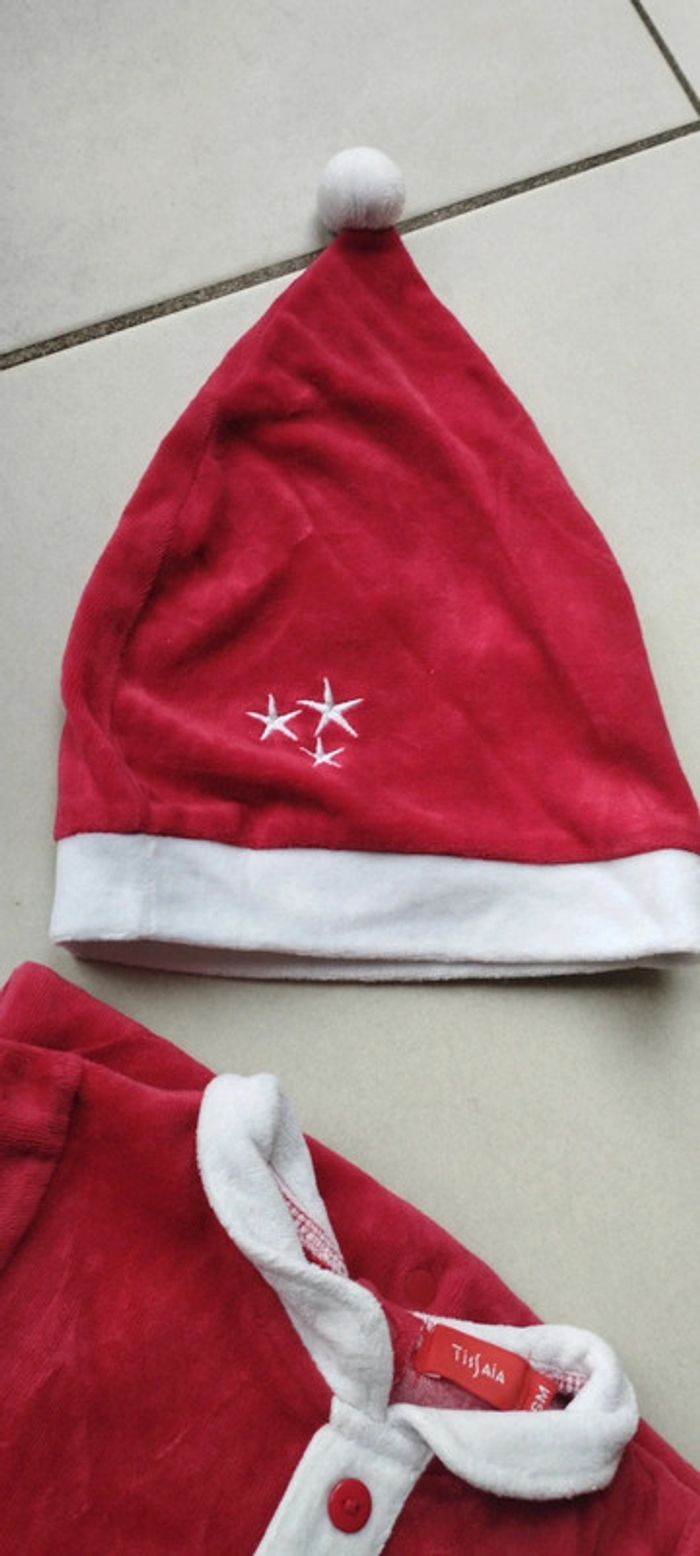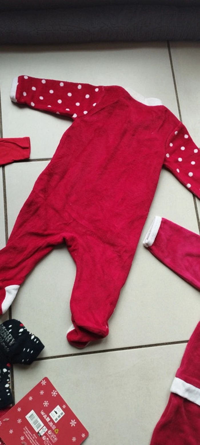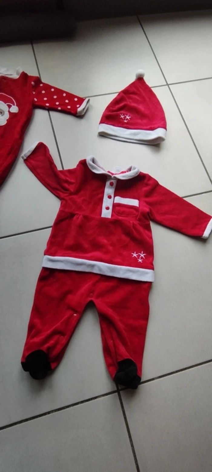 Lot d'habits de Noël en 6 mois 2 Pyjamas (porté une fois) dont un avec son bonnet assorti; 1 Bodie manches longues; 1 paire de chaussons (neufs) 1 paires de chaussettes (neuves) Un bavoir.