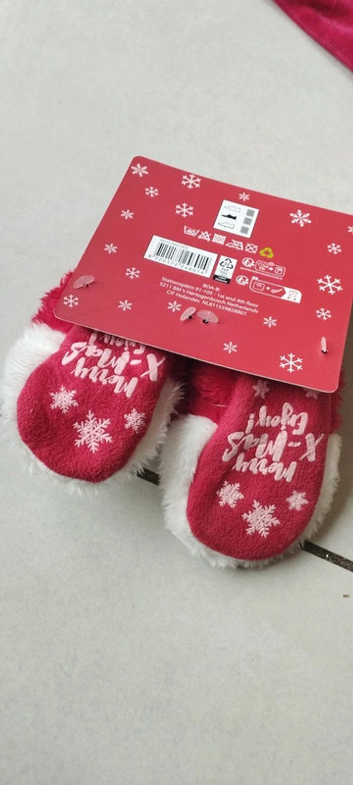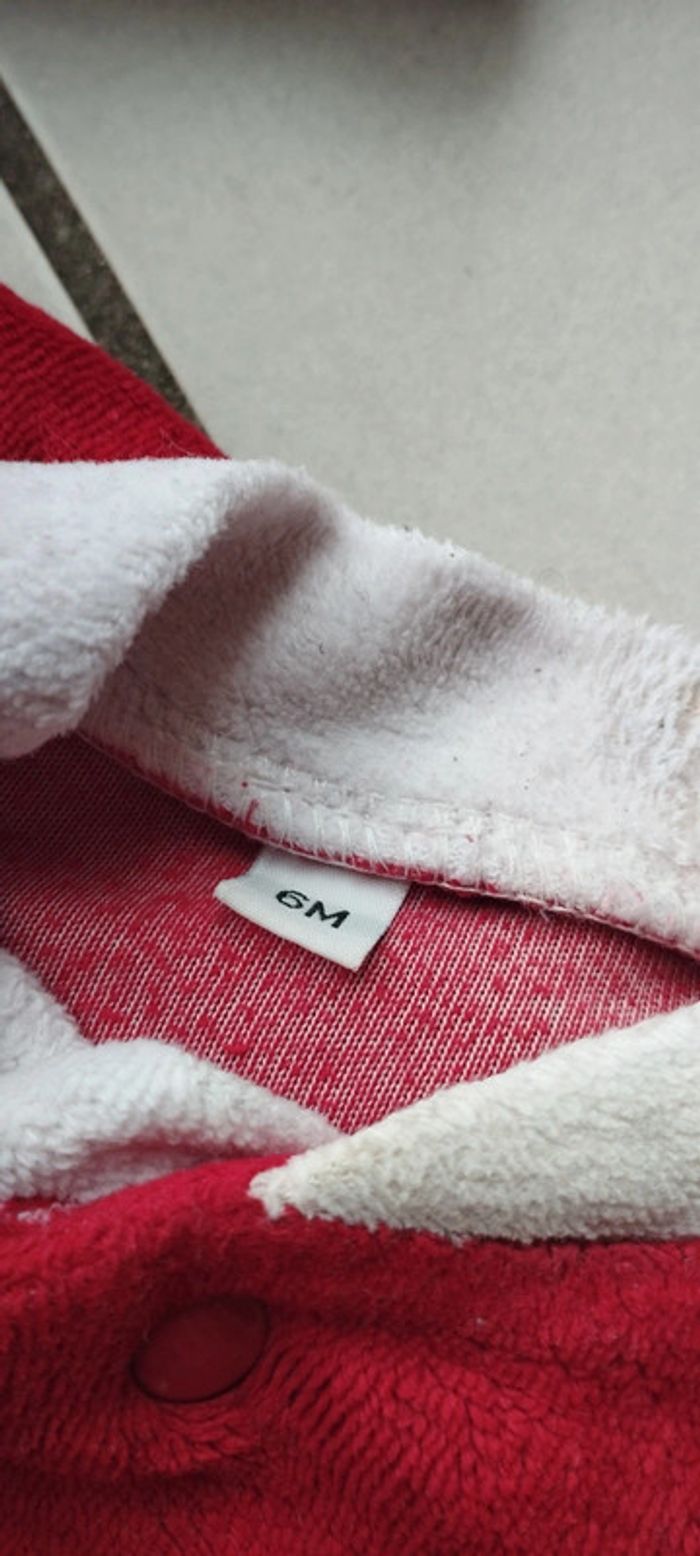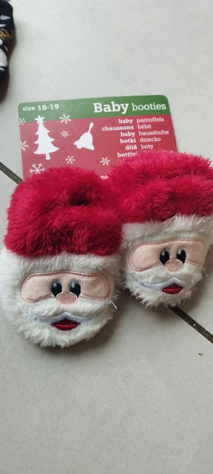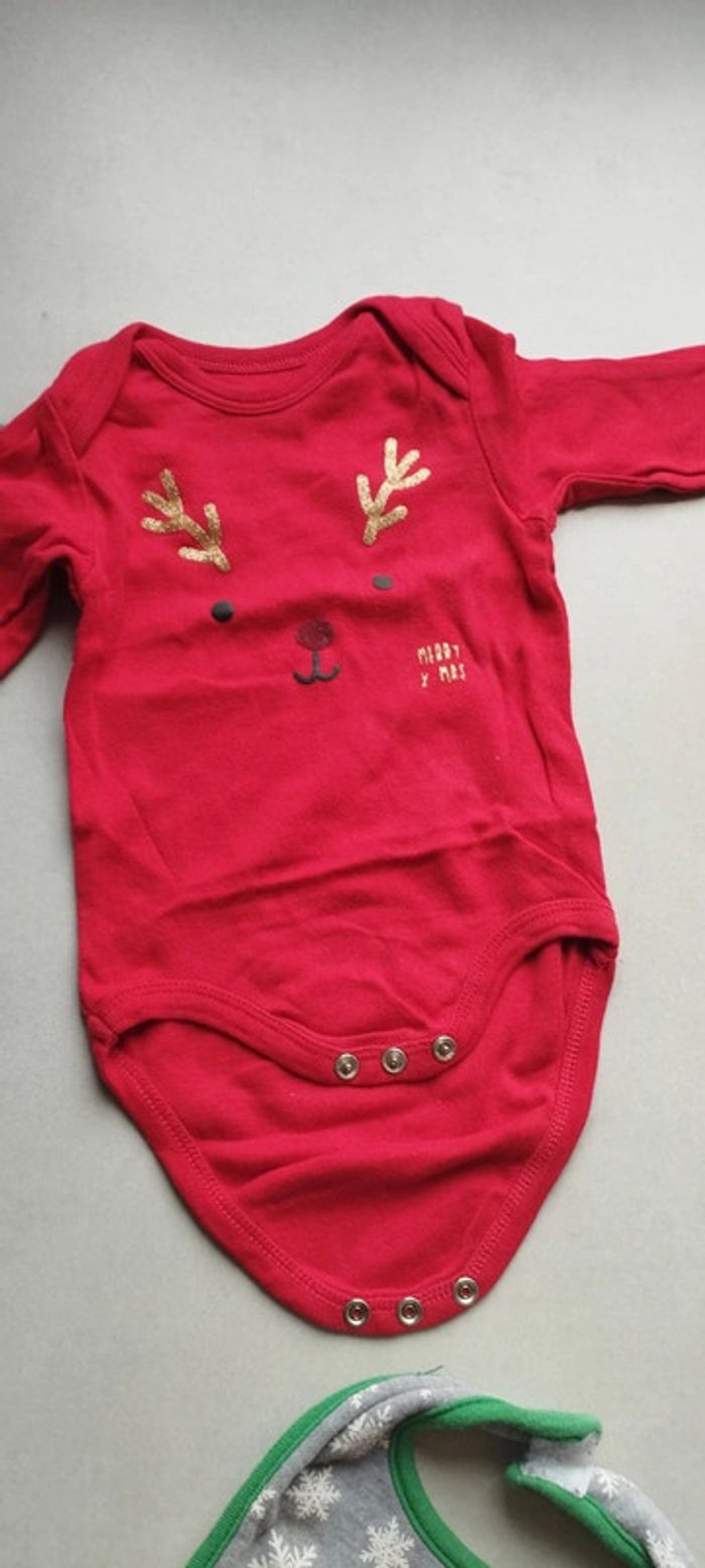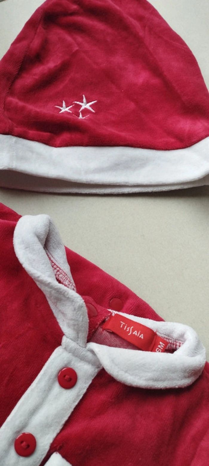 Lot d'habits de Noël en 6 mois 2 Pyjamas (porté une fois) dont un avec son bonnet assorti; 1 Bodie manches longues; 1 paire de chaussons (neufs) 1 paires de chaussettes (neuves) Un bavoir.
