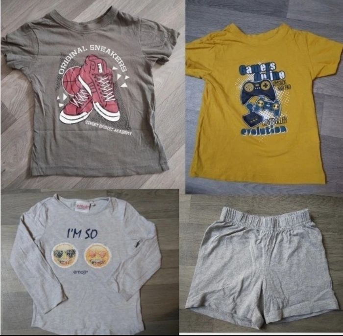 Lot t-shirt 5 ans - T-shirt gamer ( tissaia ) - T-shirt basket ( tissaia ) - T-shirt emoji sequins - short tissu minions Possible séparément