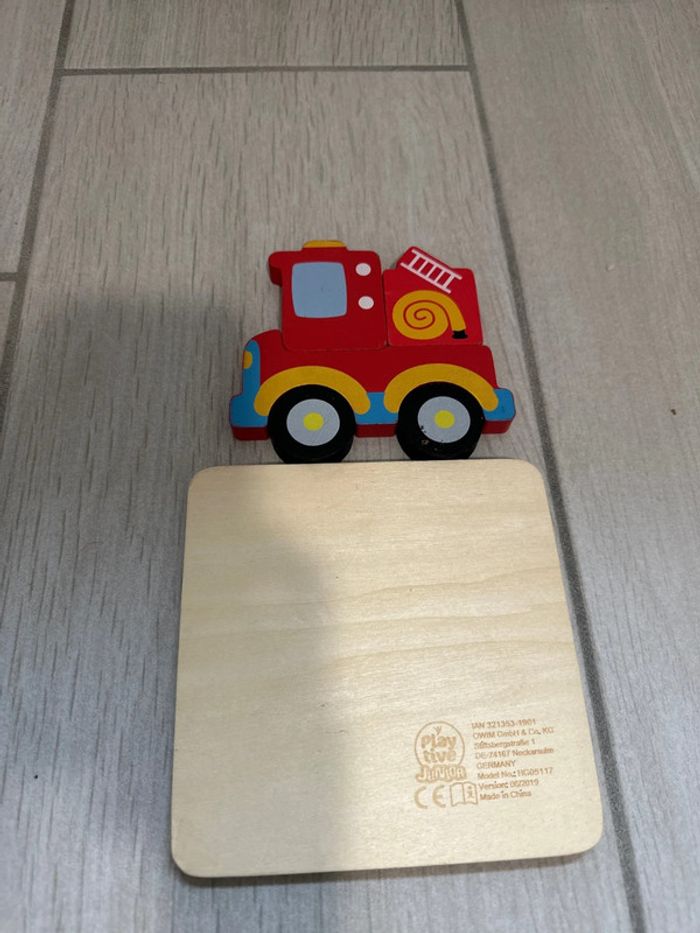 Petit Puzzle bois camion de pompier À des marques d’usure sur les roues. Légère marque de dents d’enfants..