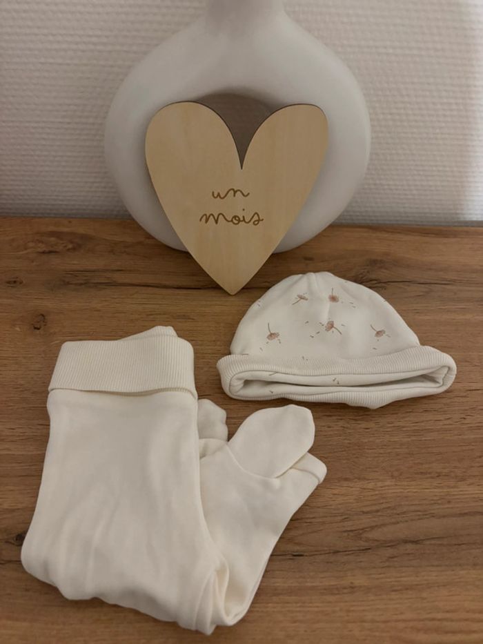 🏷️ Pantalon et bonnet 🤍 ☁️ — Taille 1mois / 52-55cm | 4kg 🦢 — Jamais portés, juste lavés, en très bon état 🤍