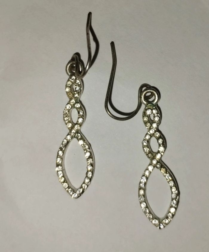 Boucles d'oreilles pendantes argentées avec petits strass blancs. Très bon état