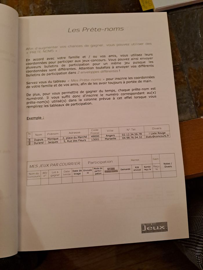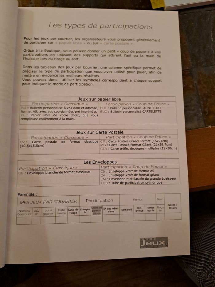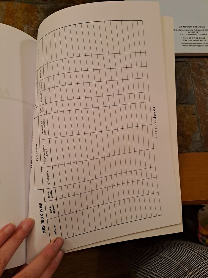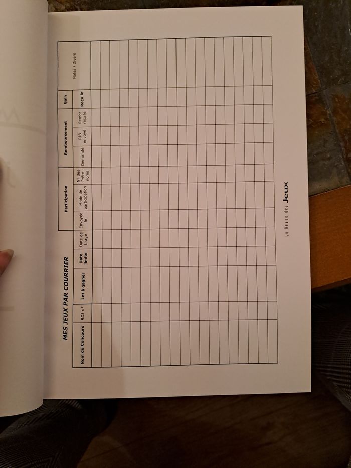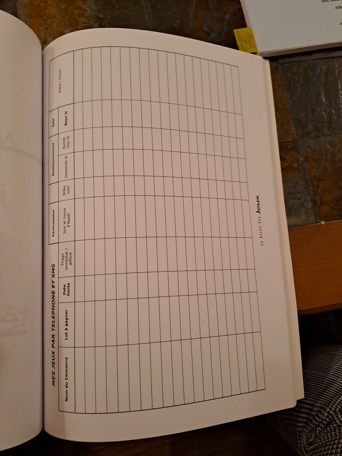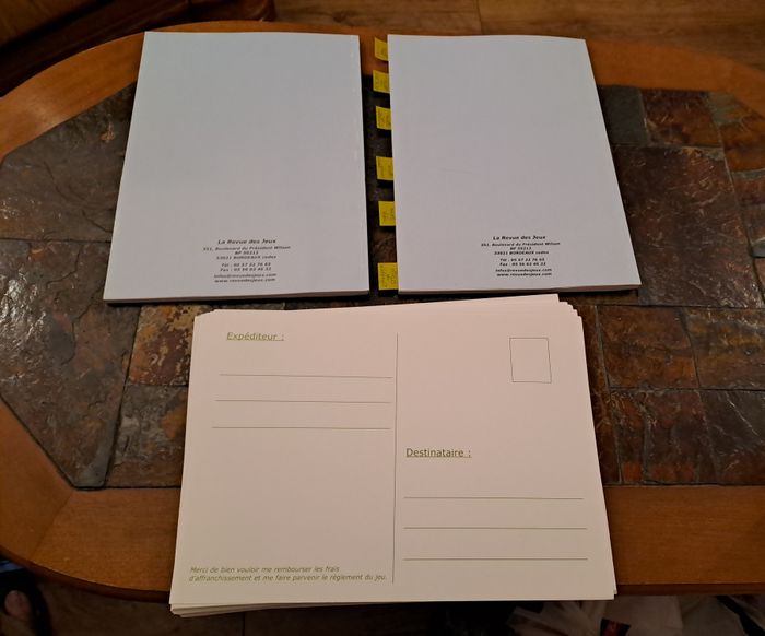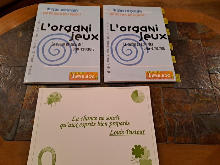 Lot de 2 cahiers organisateur de jeux concours + 43 grandes cartes postales (format A4) pour répondre aux jeux concours et avoir plus de chance d'être tiré au sort, vu la taille. Un cahier est vierge, et un autre a seulement 3 pages de complétées. Les cartes postales sont vierges. Pour comprendre ce que c'est, avant j'achetais plus magasines où on trouvé tous les jeux concours, mois par mois. Il existe des magazines qui regroupe ce genre de choses. Maintenant je n'ai plus le temps de faire ça malheureusement. Le cahier permet un suivi des jeux faits, gagnés... Prix d'achat : 48€ (voir photo facture). Je la garde, non jointe à ce lot.
