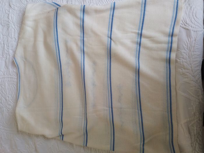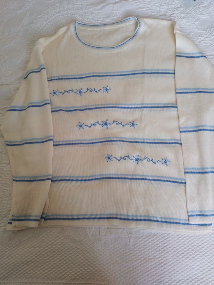 Pull blanc a rayure eg flleurs. En très bon état. Taille 48/50 100% acrylique. Envoie rapide et bien emballer.