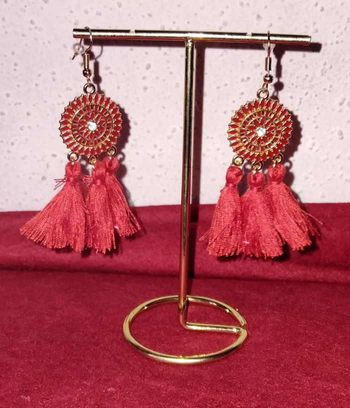 Paire de boucles d oreilles attrape rêve rouge et doré  neuf - photo numéro 2