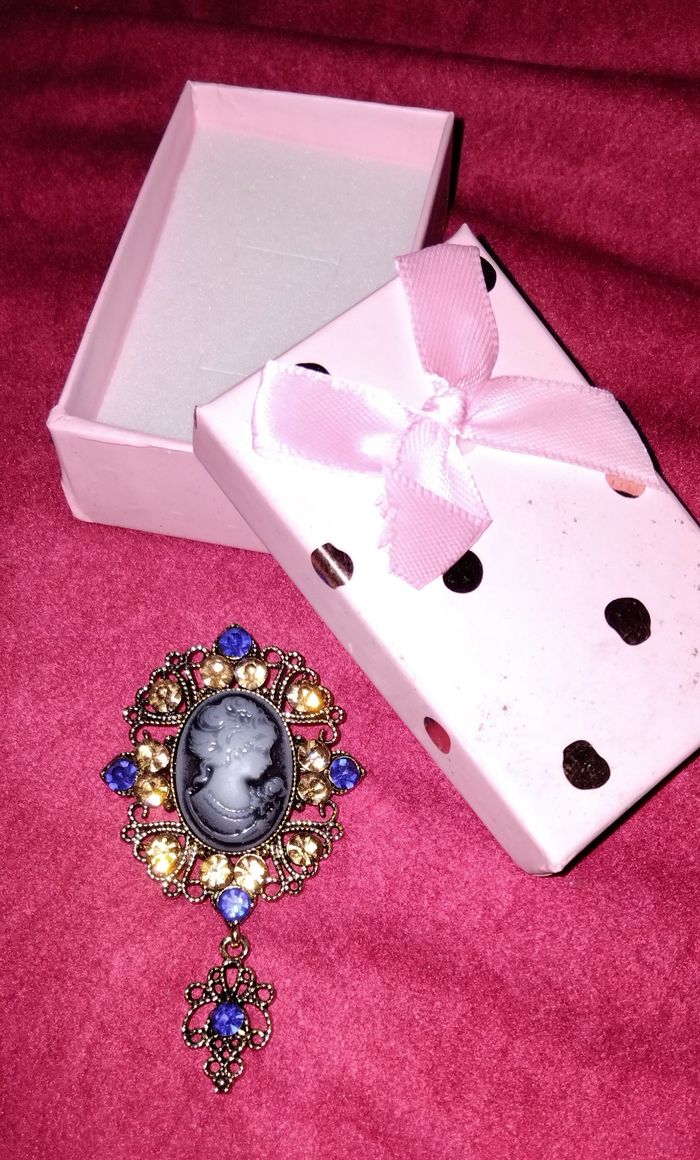 Broche came bleu et doré tête de femme de couleur bleu Pierres de couleurs bleu et orange Longueur : 7 cm Largeur : 4 cm.