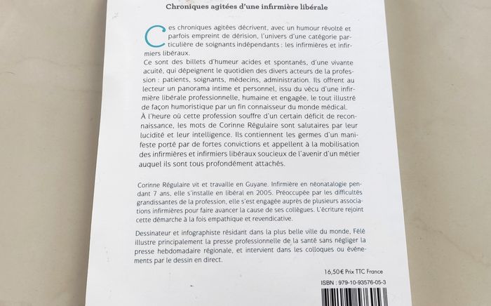 Ces chroniques agitées décrivent, avec un humour révolté et parfois empreint de dérision, l’univers d’une catégorie particulière de soignants indépendants : les infirmières et infirmiers libéraux. Ce sont des billets d’humeur acides et spontanés, d’une vivante acuité, qui dépeignent le quotidien des divers acteurs de la profession : patients, soignants, médecins, administration. Ils offrent au lecteur un panorama intime et personnel, issu du vécu d’une infirmière libérale professionnelle, humaine et engagée, le tout illustré de façon humoristique par un fin connaisseur du monde médical. À l’heure où cette profession souffre d’un certain déficit de reconnaissance, les mots de Corinne Régulaire sont salutaires par leur lucidité et leur intelligence. Ils contiennent les germes d’un manifeste porté par de fortes convictions et appellent à la mobilisation des infirmières et infirmiers libéraux soucieux de l’avenir d’un métier auquel ils sont tous profondément attachés. Les articles rédigés par Corinne Régulaire et illustrés par Félé mêlent à la fois humour, dérision, lassitude, abattement, spontanéité et esprit de révolte.