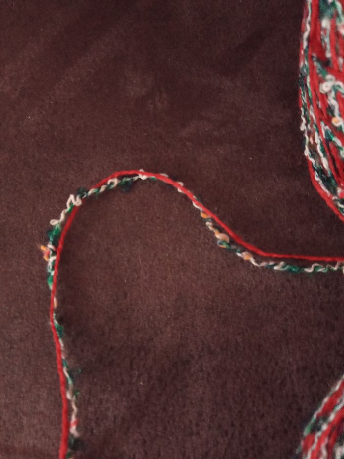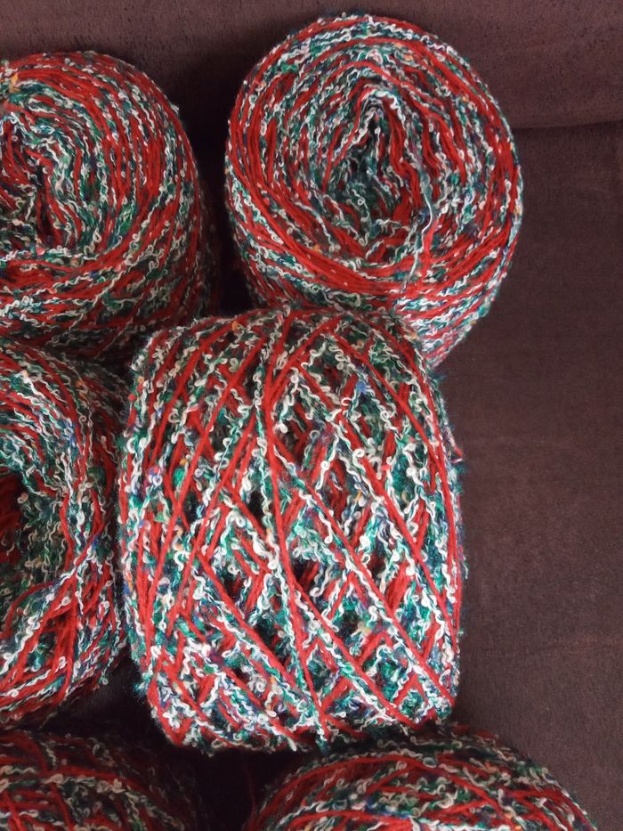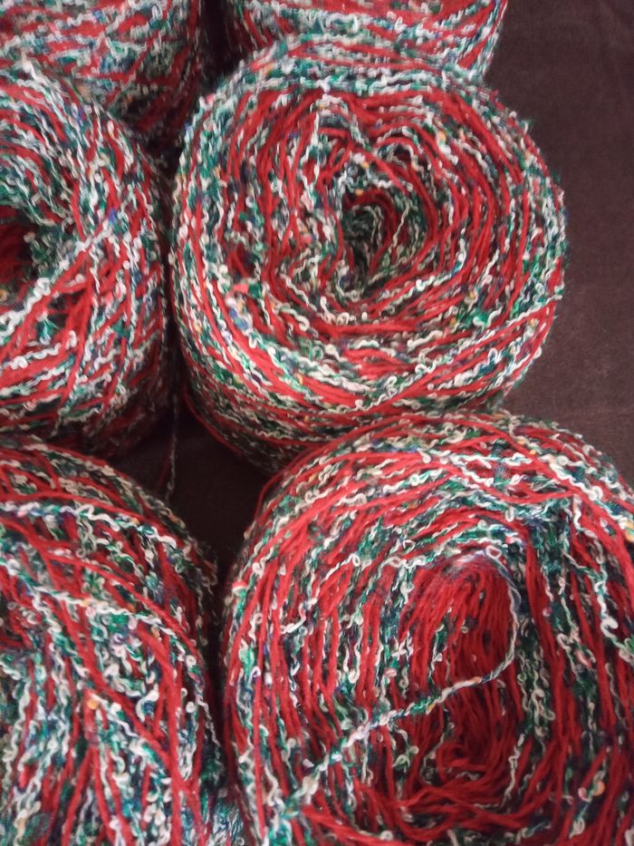 Lot de 6 Pelotes Fantaisies effet bouclettes (580g) Couleur: Rouge, Vert et Blanc 1 fil fin fantaisie légèrement effet bouclettes + 1 autre fil simple plutôt fin au total 580g Aiguilles N°2-2,5 Lot en parfait état