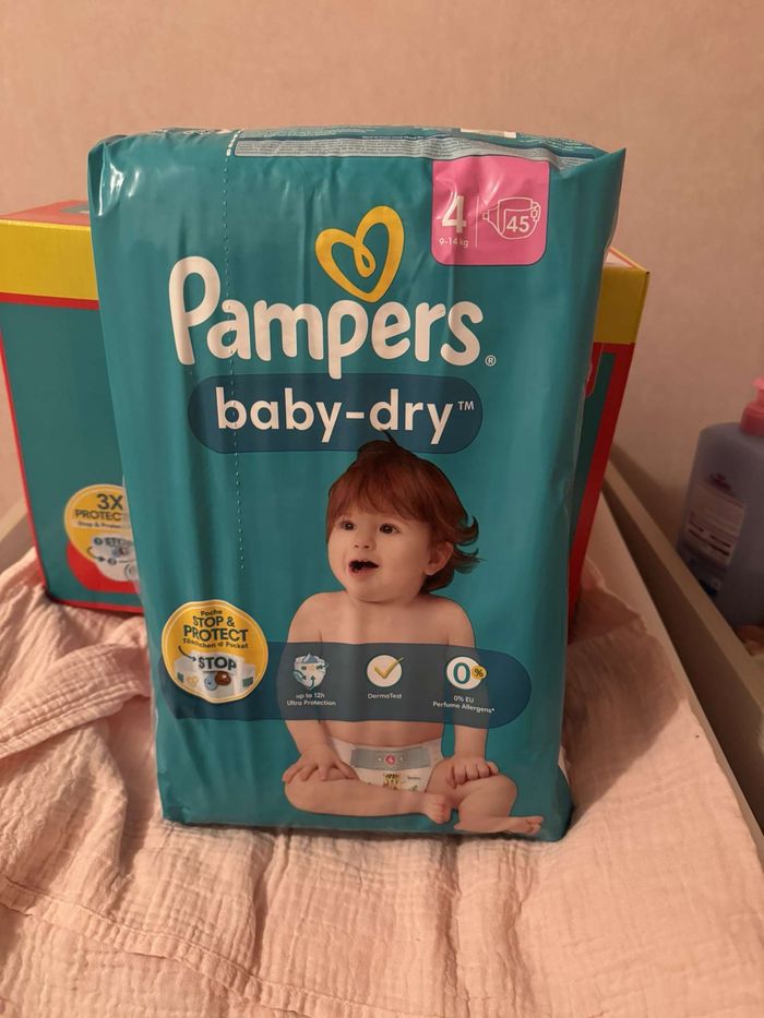 Vends couches Pampers baby dry taille 4 de 45 couches 15 euros Paquet jamais ouvert car ce n’est plus la bonne taille