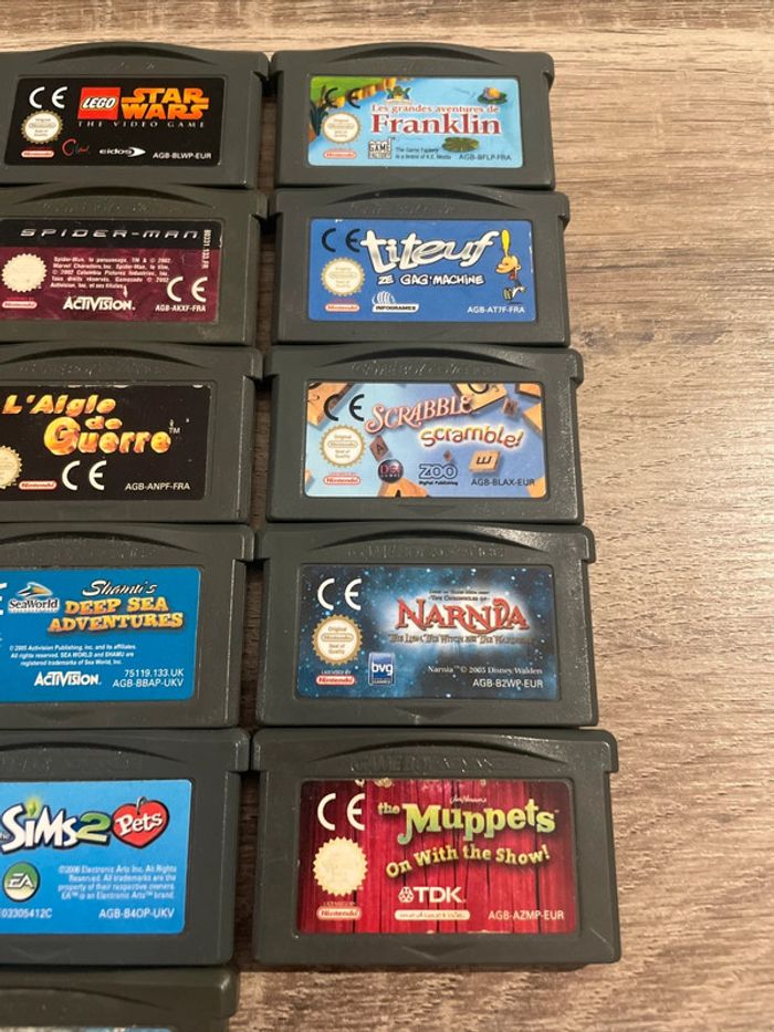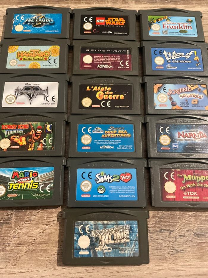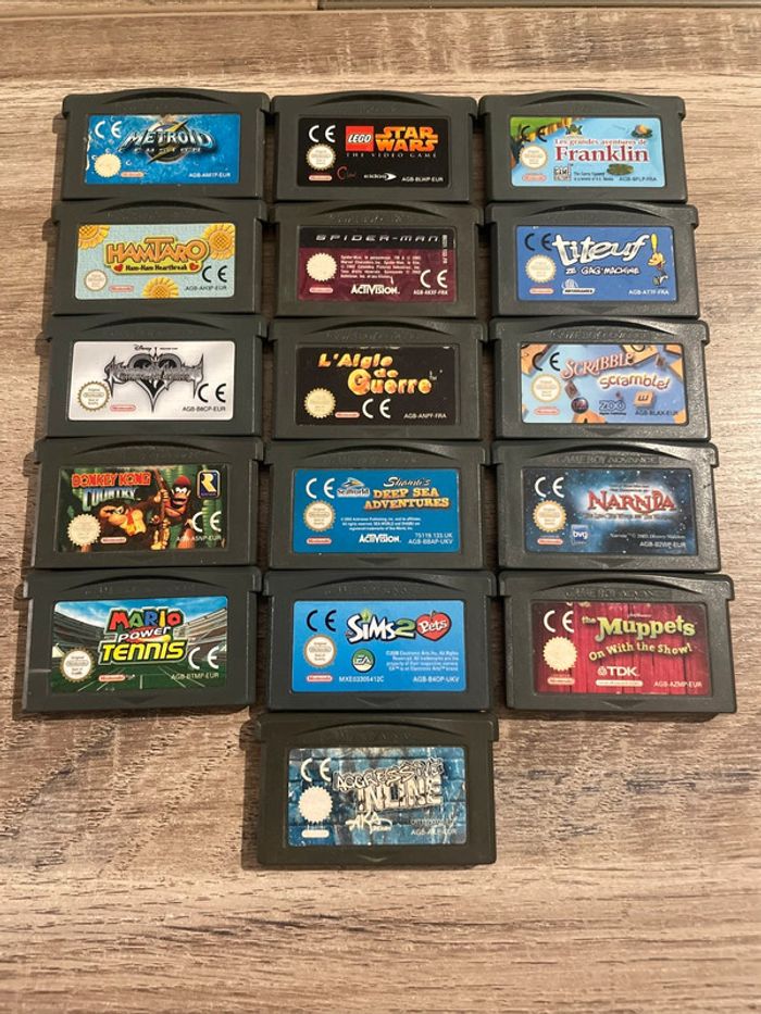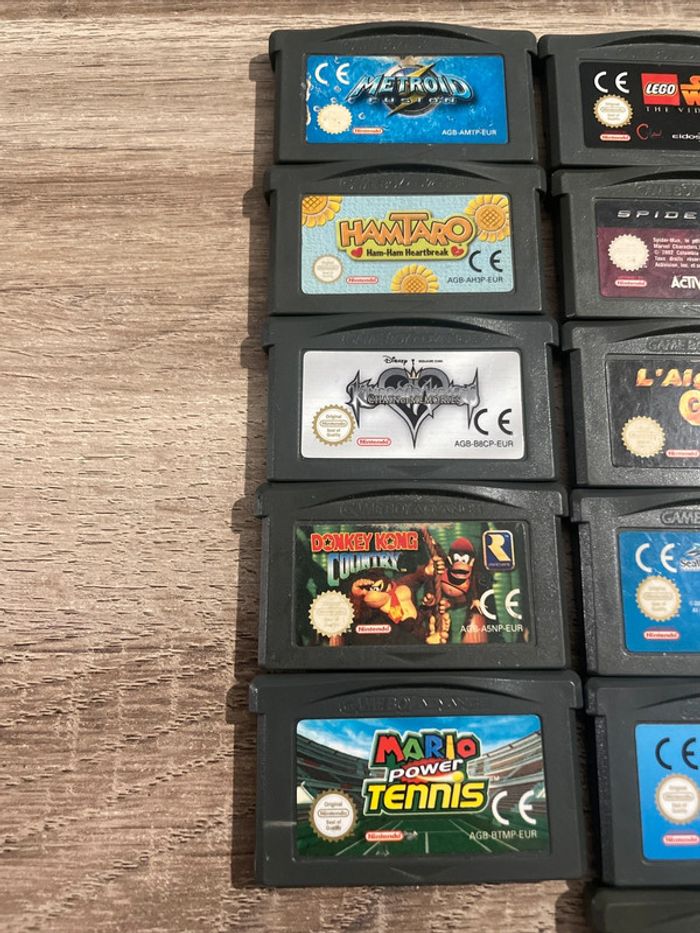 Lot De 16 Jeux Nintendo Game Boy Advance Metroid Fusion Hamtaro Kingdom Hearts Donkey Kong country Mario Power Tennis Lego star wars Spiderman etc… Tous les jeux sont des originaux Idéal pour débuter collection