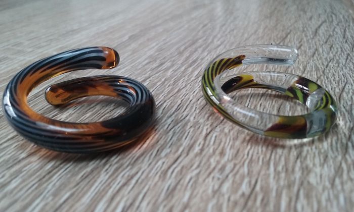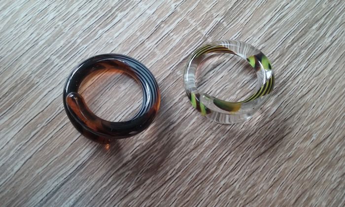 Une dans les tons marron, une dans les tons verts, diamètre de la bague 1,92 cm pour une circonférence du doigt de 6,03 cm. Le lot 10€!