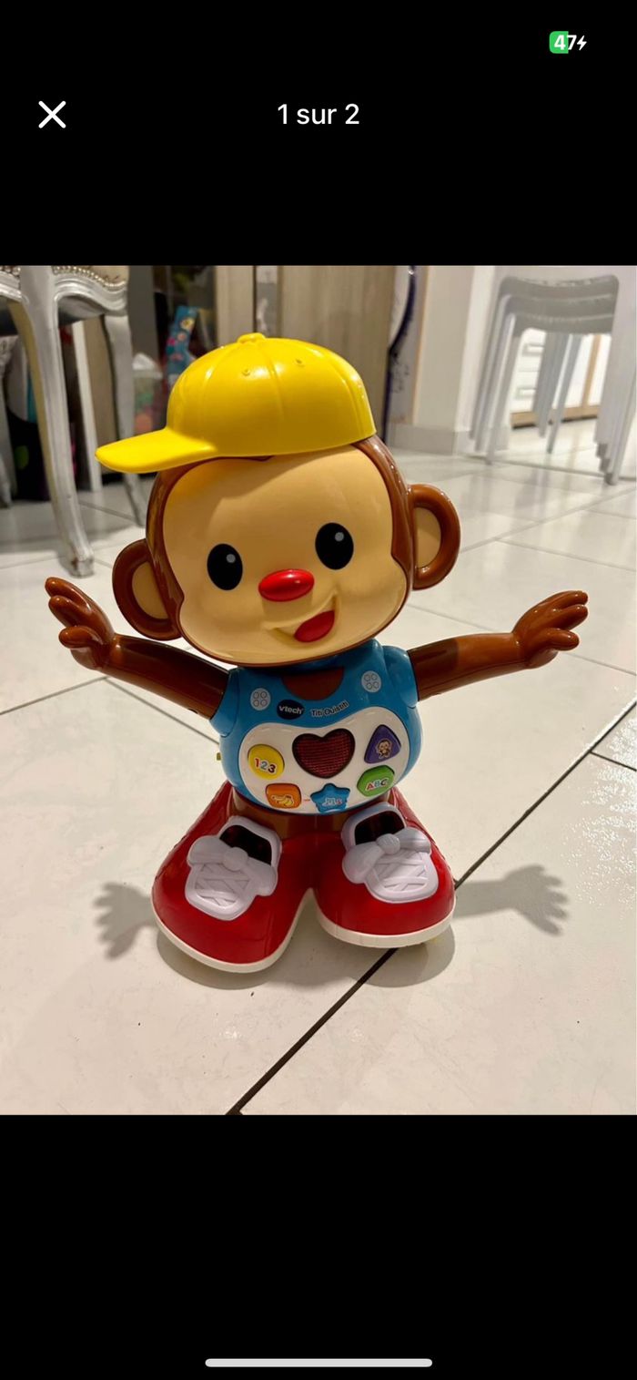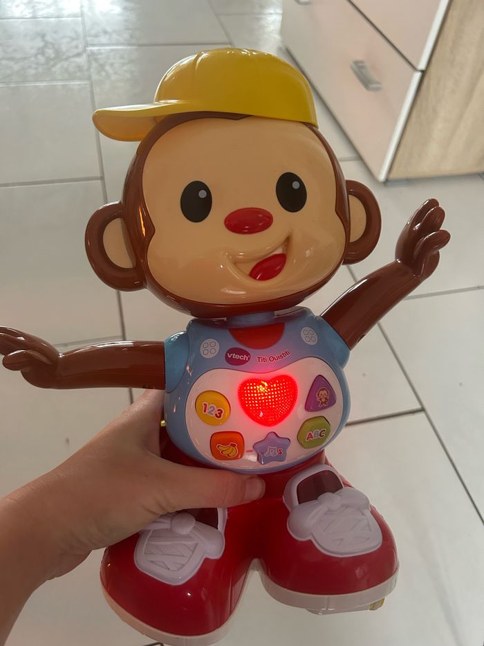 Très bon état Titi ouistiti vtech Titi Ouistiti de Vtech, ce petit singe malicieux, trop rigolo, ferra plaisir à votre enfant ! Il appelle l'enfant et il s'enfuit dès que bébé cherche à l'attraper ! Grâce à ses 6 touches lumineuses sur son corps, bébé découvre les premiers chiffres, les couleurs et des mélodies… Contient 4 chansons et 17 mélodies qui sauront divertir bébé.Titi saura divertir bébé avec ses modes de jeu : Bébé suit Titi, Bébé danse avec Titi et Titi se cache et incite bébé à le chercher.